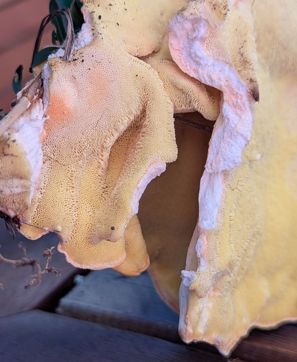 gestern ist mir beim Radlfahren dieses Monster aufgefallen. Standort ist in Oberbayern direkt an einem Feldweg am Waldrand (Mischwald, leichte Hanglage gen Süden, also sehr sonnig aber auch ziemlich exponiert gegen Regen und Wind). Dürfte knapp einen Meter lang und rund 40cm breit sein. Ist das eine Art Baumpilz? Ich konnte nicht drunter schauen, aber man erkennt keinen Baumstumpf o.ä. auf dem er wächst. Den Geruch würde ich als mild und unauffällig beschreiben, die Bruckkanten/Druckstellen verfärben sich nicht. Das spräche gegen den Riesenporling (Meripilus giganteus) den mir ChatGPT ausgespuckt hat. 😇Das es keine Krause Glucke ist (erste Vermutung der KI) war mir sofort klar, passt von der Struktur gar nicht.