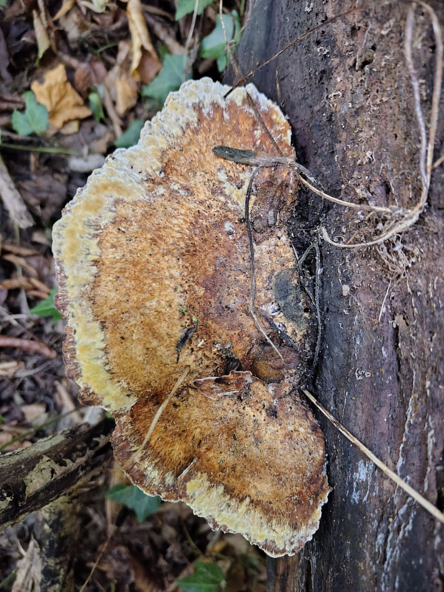 Ich hab folgenden Fund gemacht, den ich für einen Schillerporling halte, ich denke da an Inonotus hispidus oder cuticularis, bin aber unsicher.