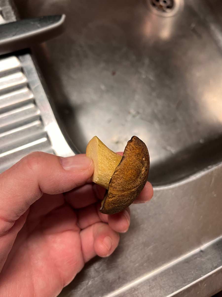 Er blaut bei Anschnitt nicht, hat eine feste Konsistenz. In meinen Büchern finde ich keine passende Übereinstimmung für diesen Pilz mit dunkel-oliv-farbenen Röhren.
