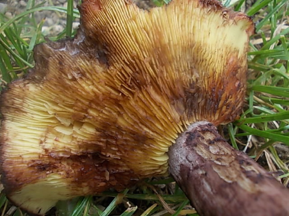 ich weiss der FK ist schon etwas älter. Der wird auch nicht besser , wenn er hier unbestimmt herum liegt. Ich hatte ihn mit dem Gedanken mitgenommen, "Oh, ein mir unbekannter Krempling?" wohl wegenden Lamellen. Doch daheim, war ich dann ratlos. Ein Krempling ist das nicht. Hut passt nicht, Lamellen sind nicht abschiebbar. Mit ca 10cm fürn Risspilt zu gross und "unrissig", fürn Fälbling zu dunkel, fürn Schleierling keine Schleierzone .. dafür Streifen am Hutrand.