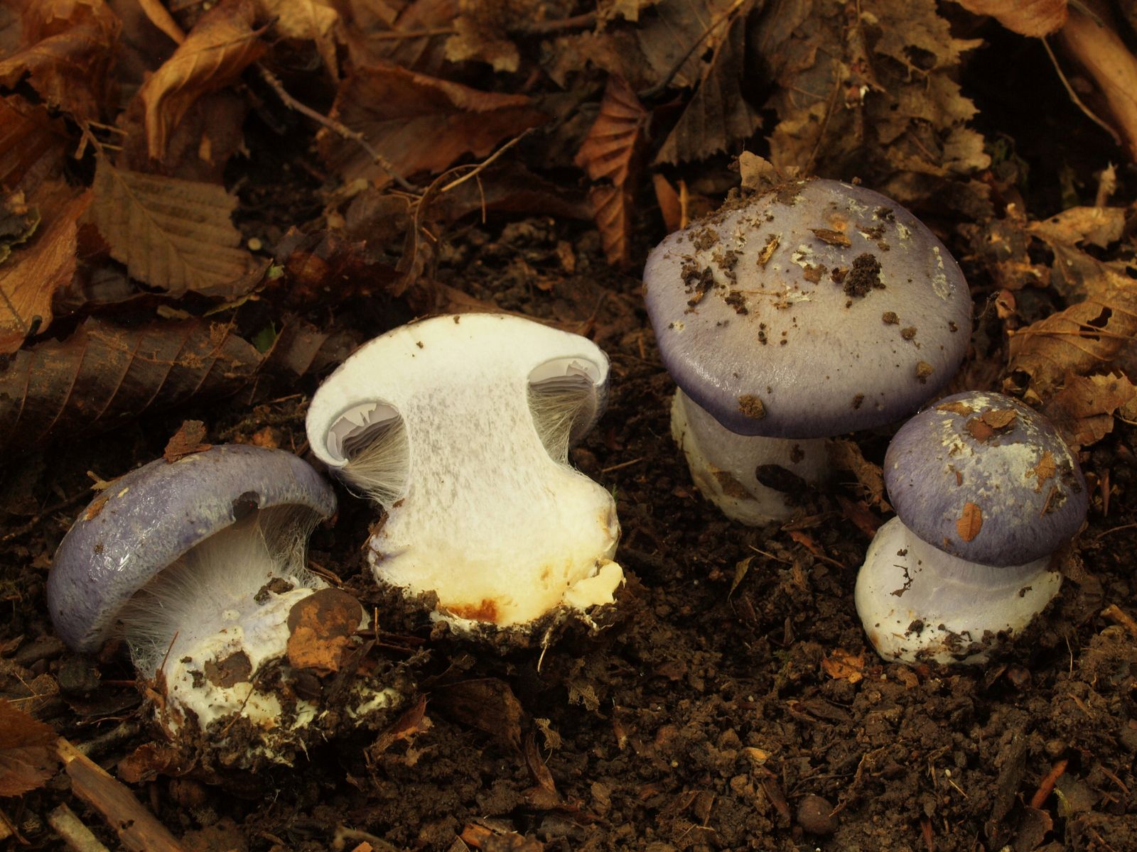 Auf den ersten Blick fielen und 3 blaue Klumfüße ins Auge und es wurden immer mehr. Die sattblaue wenig ausblassende Farbe, kräftiges blaue Velum, blasses in der Knolle gelbliches Fleisch und elliptische Sporen führen zu