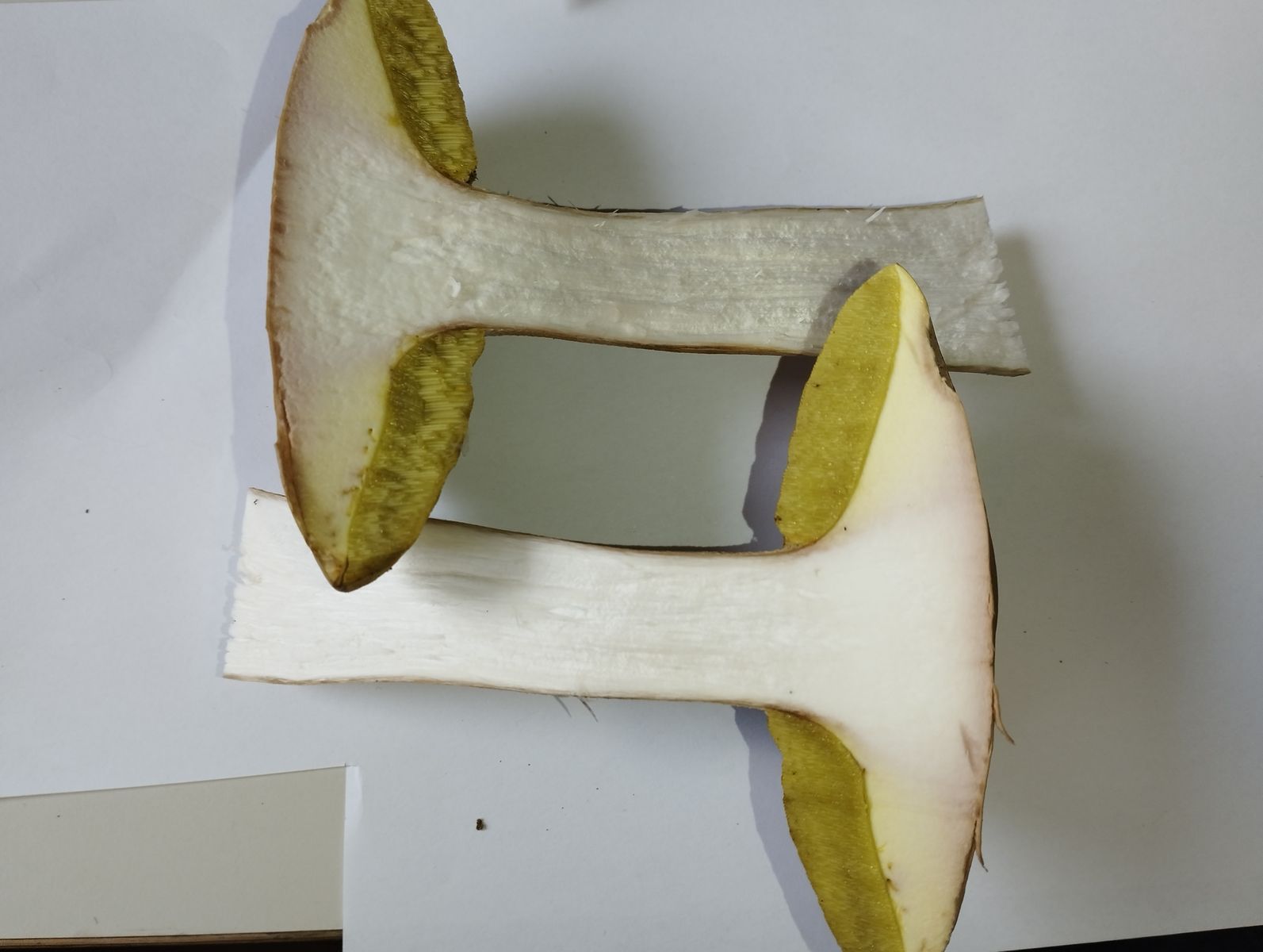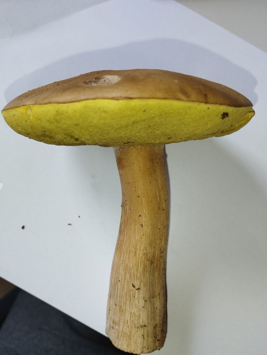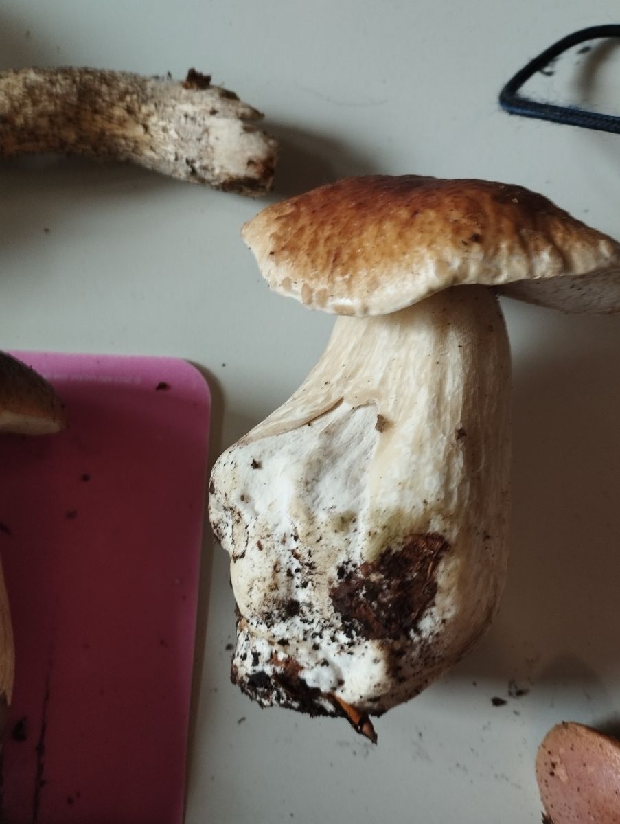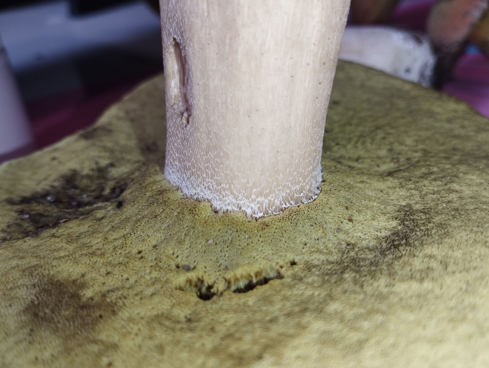 2. Nach Anschnitt keine Verfärbungen am Fruchtkörper jedoch scheinbar durch den Druck beim Transport eine leicht rote Verfärbung die nicht erst als Reaktion mit der Luft kam. Was mich irritiert ist die weiße Netzfärbung am oberen Stielende wie auf den letzten Bildern ersichtlich. Dazu der eher beige hellbraun anstatt Gelb wirkende Stiel.