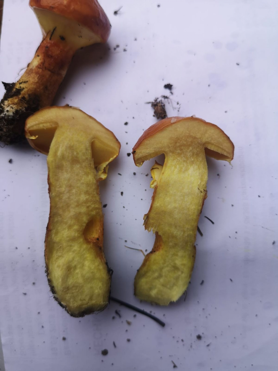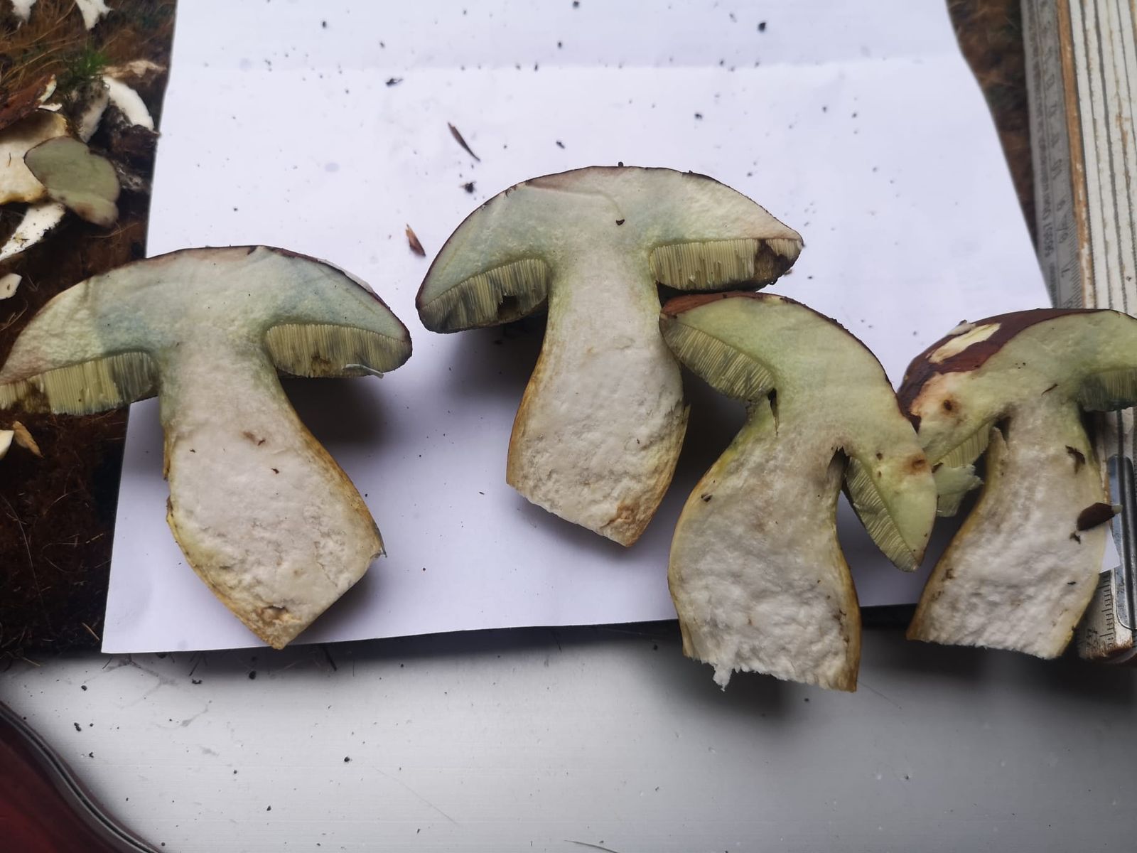 - Beschreibung Fruchtschicht: Röhren bei jüngerem Exemplar hell/cremefarben, bei den älteren grüngelb, auf Druck sehr schnell blauend, leicht am Stiel herablaufend, Fleisch weiß, verfärbt sich stellenweise bläulich nicht im Anschnitt