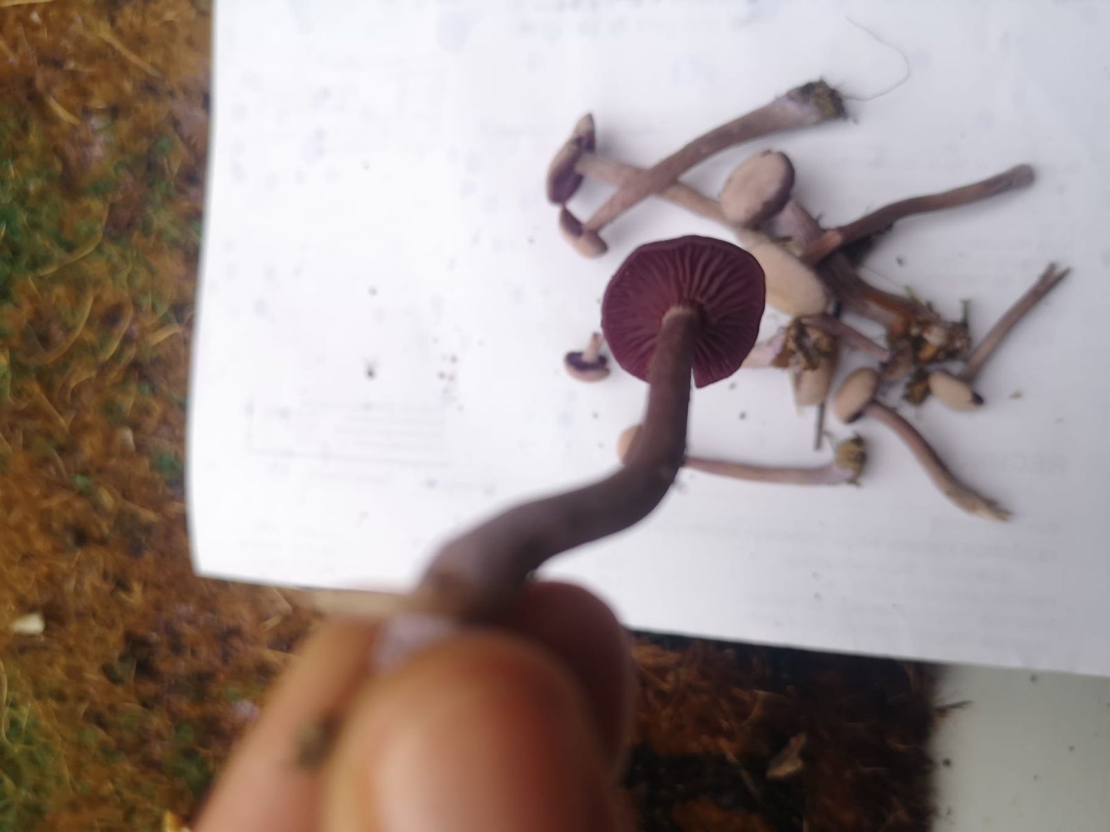 - Beschreibung Stiel: Durchmesser bis 1cm, Höhe bis 5cm, violett wie der Hut, weißlich längsgefasert, an der Stielbasis violettes Myzel (?), zäh, faserig