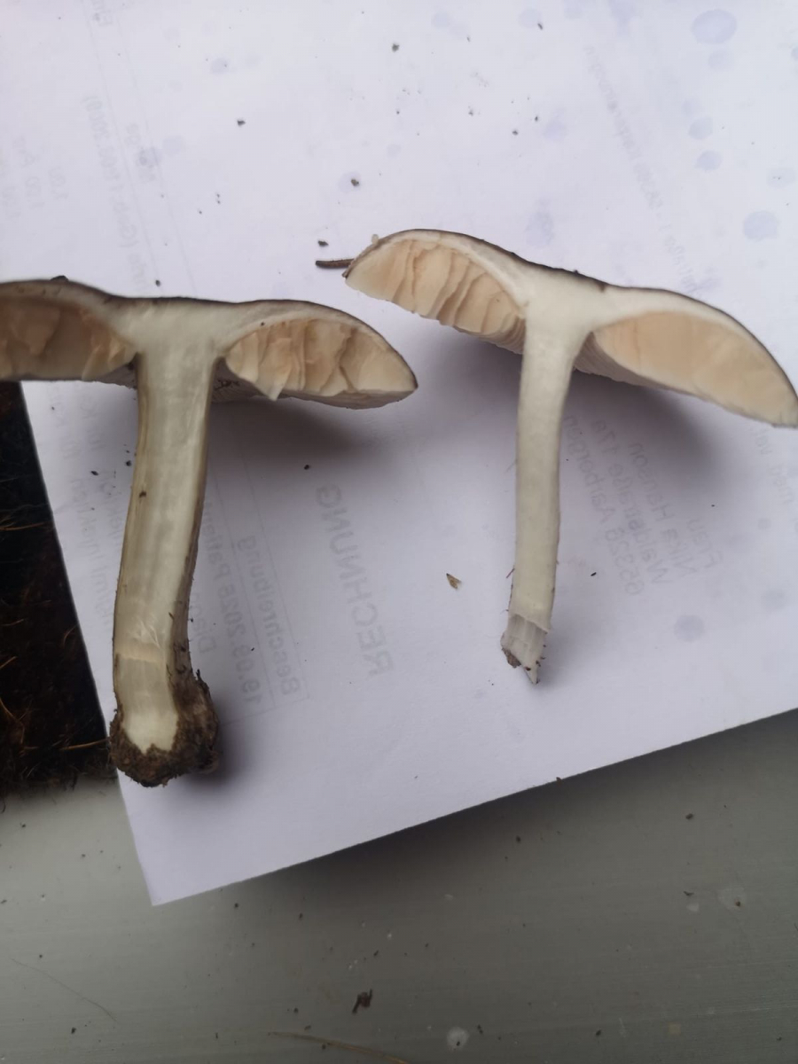 - Beschreibung Stiel: 6cm Höhe, 1cm Durchmesser, Basis schwach verdickt bis keulig, schmutziges weiß, dunkle Längsfasern, Stiel leicht von Hut trennbar