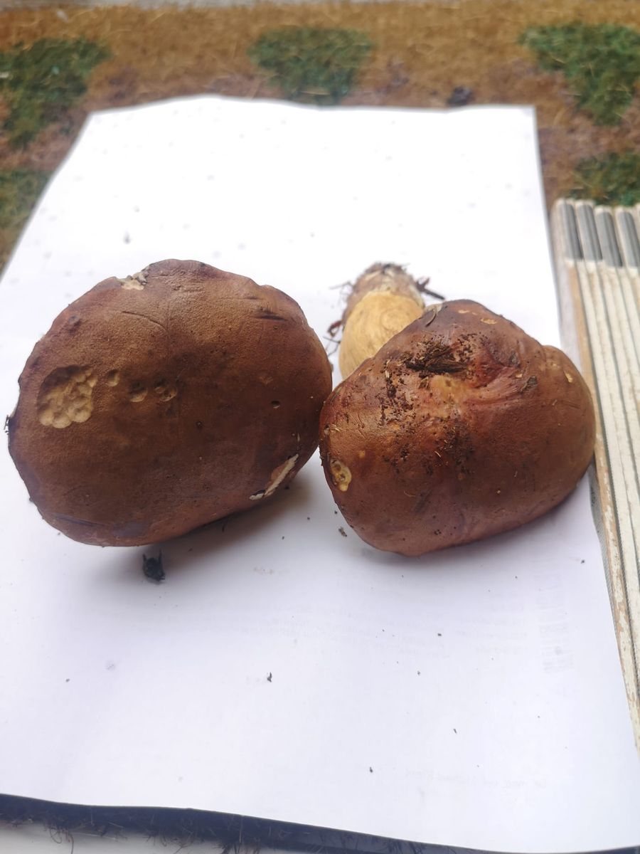 - Beschreibung Hut: Durchmesser etwa 6cm, matt, dunkelbraun, leicht faserig, mittig dezent "eingedellt", Huthaut dünn abziehbar