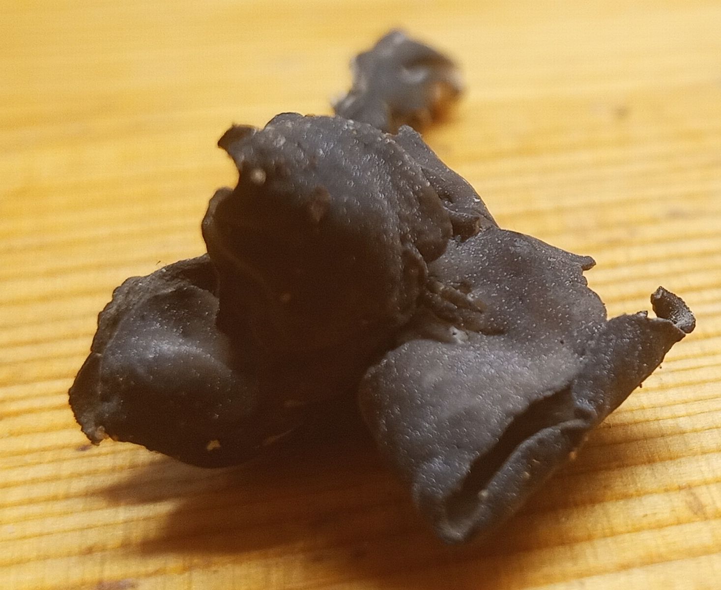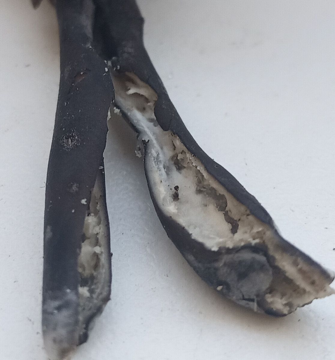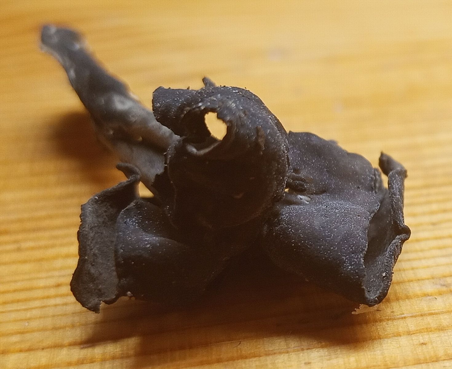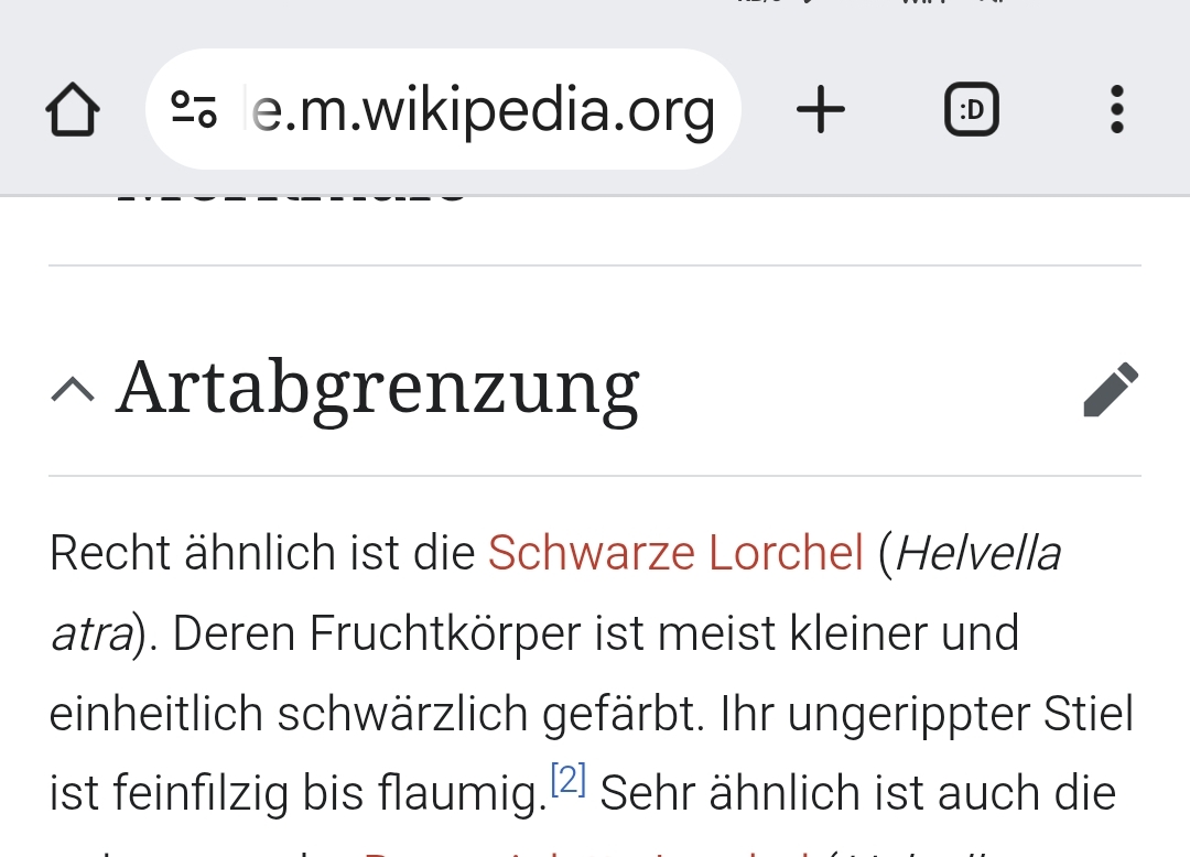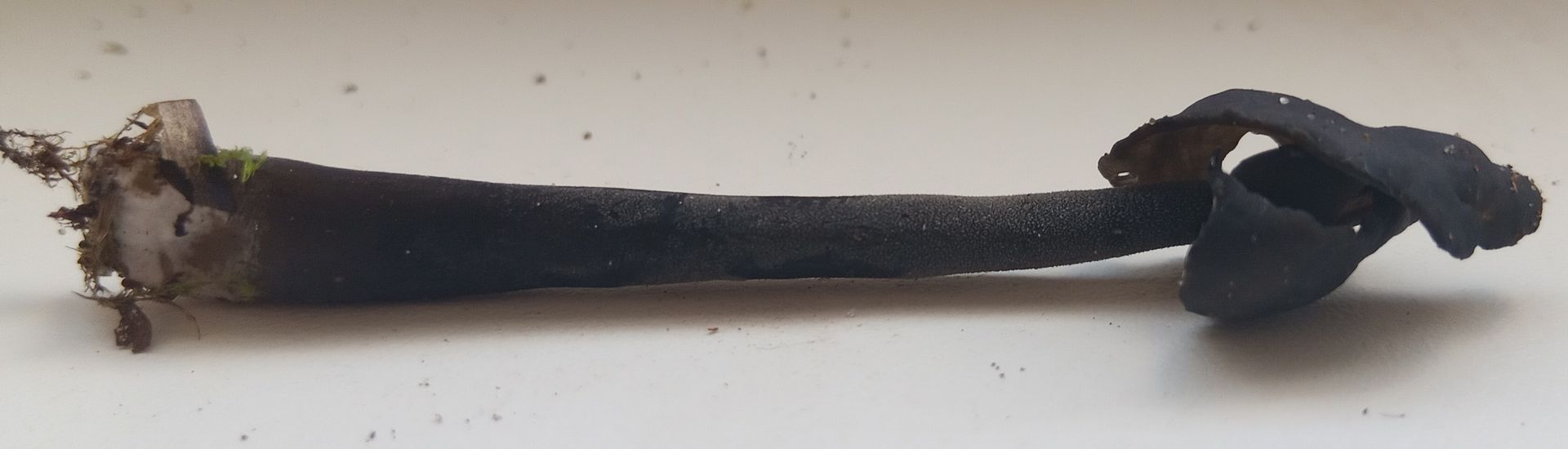 Ich denke, ich habe etwas Seltenes gefunden. Die Lorchel ist bis auf die Stielbasis schwarz. Das, was sich Hut nennt, ist von beiden Seiten schwarz. Der Stiel ist glatt, keine Rillen vorhanden. Die Stielbasis geht von dem Schwarz über ein Braun zum Weiß über. Auf einem Weg im Mischwald gefunden. Alle ähnlichen Lorcheln, die ich verglichen habe, passen nicht wirklich. Die Lorchel ist 7 cm lang.