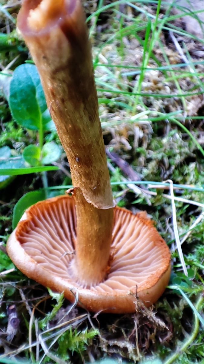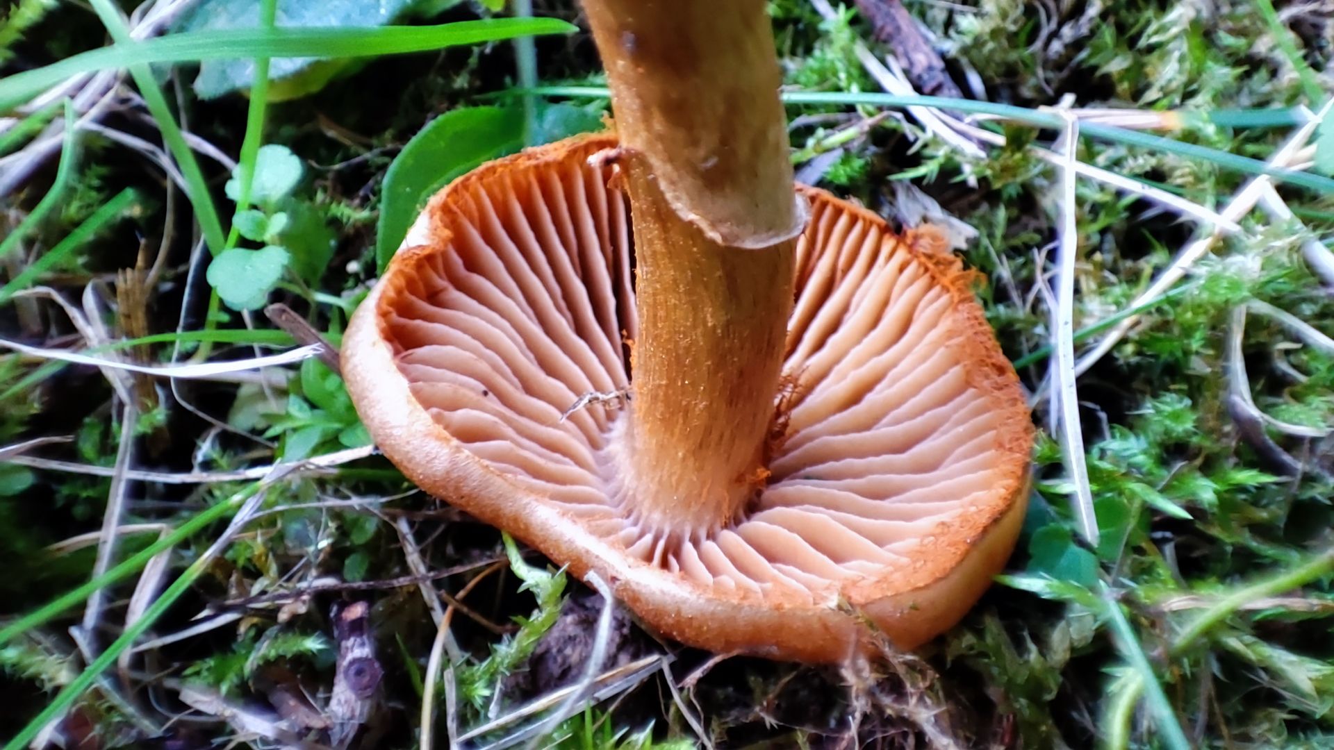 ART UND BESCHAFFENHEIT DER FRUCHTSCHICHT: Orangebraune, ziemlich auseinanderstehende, untermischte bogenförmige Lamellen, Lamellenschneiden gekerbt, ausgebuchtet/mit Zahn angewachsen (?)