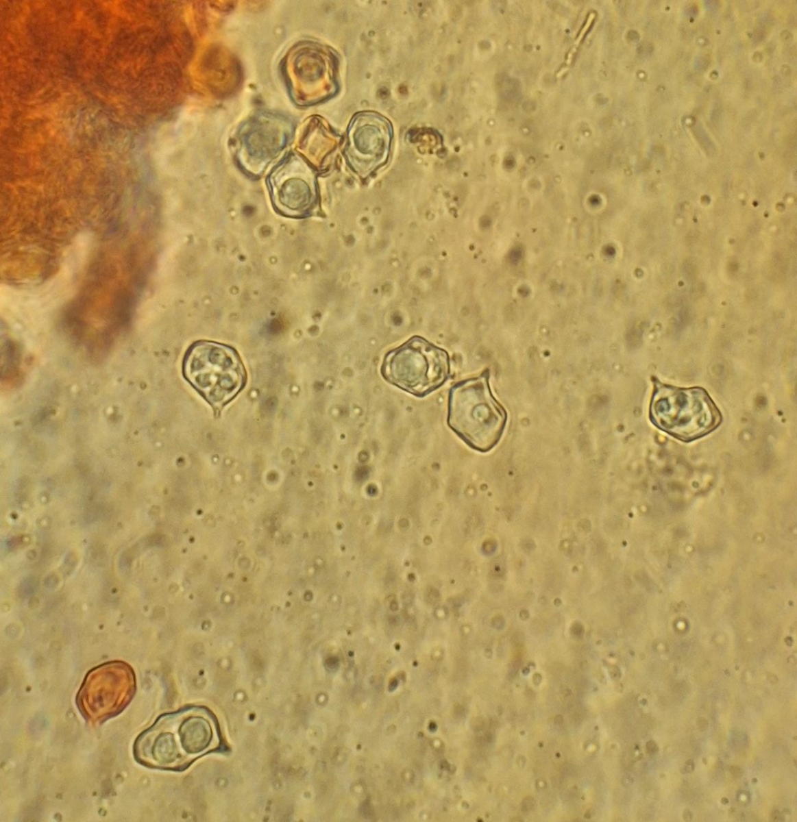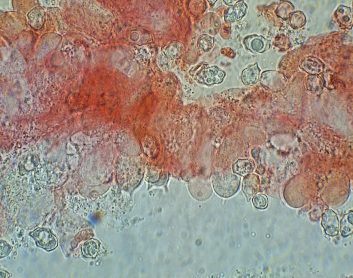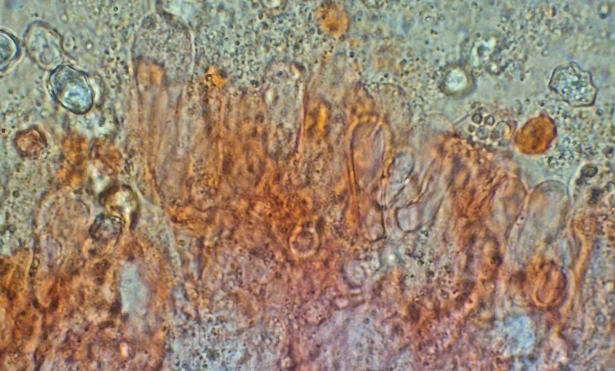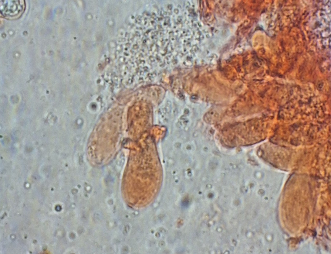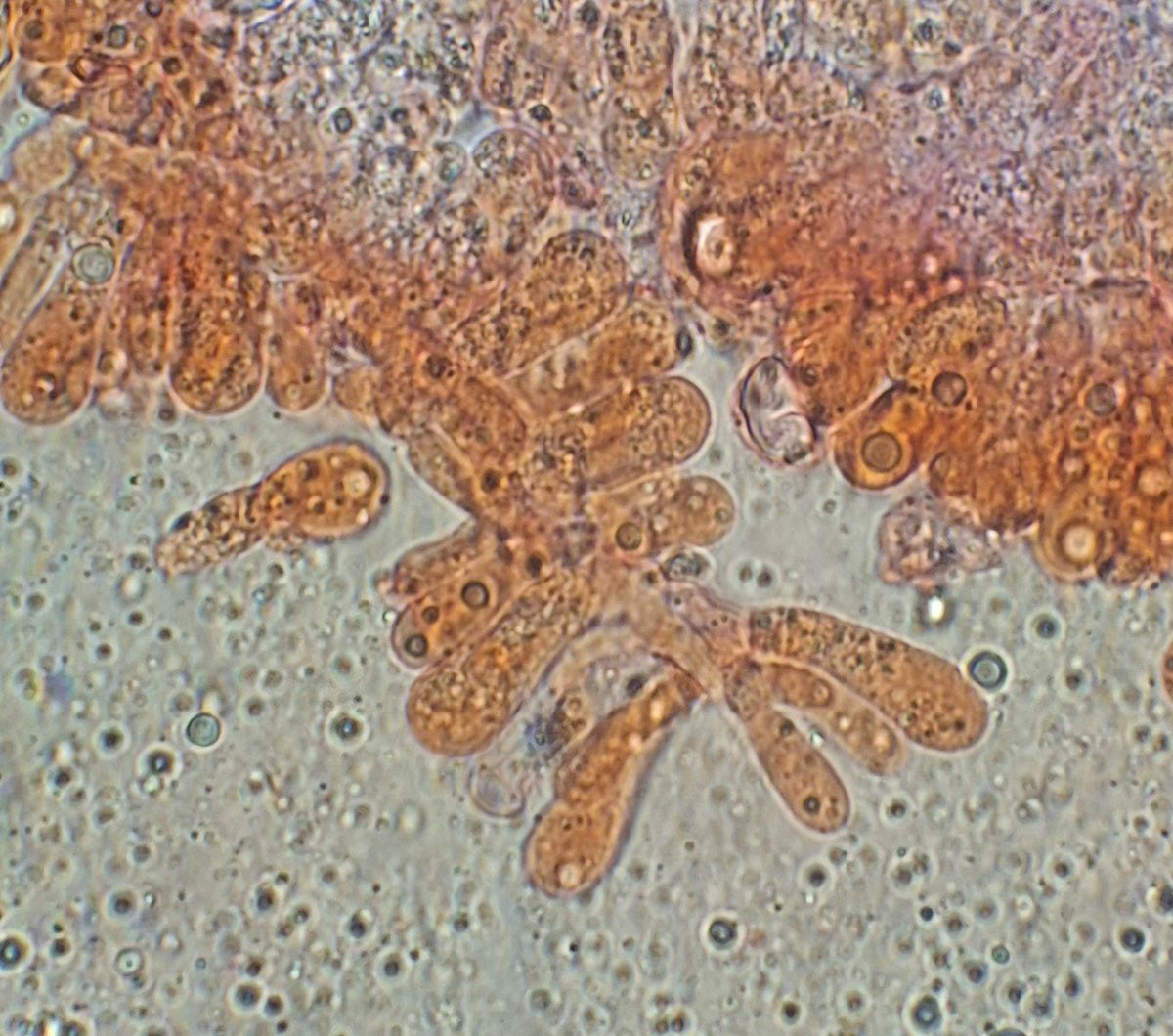 gestern spät abends hatte ich noch von dem kleineren der beiden Pilze, der auch angesichts hellerer Lamellen als etwas jünger erschien, ein Stück Lamelle untersucht. Da ich finde, dass die Cheilozystidien viel schneller kollabieren als Basidien, habe ich ein Stück aus Randnähe genommen - wo dann auch die kopfigen Cheilozystidien gar nicht zu sehen waren. Sauber separiert bekommen habe ich das nicht, aber soweit die Basis die Basidiolen erkennbar ist, sind die immer schon gerundet und nirgens nach Schnalle aussehend.
