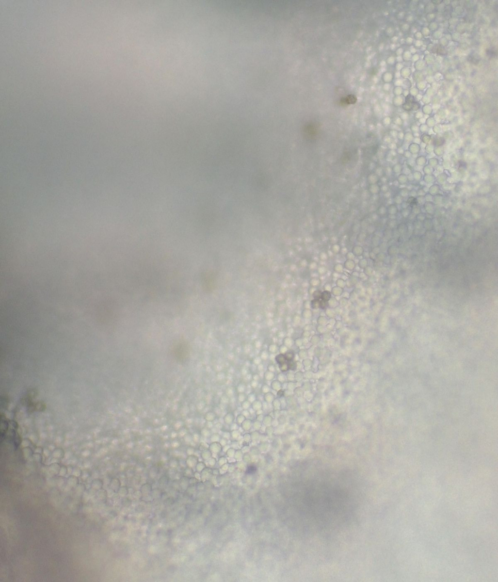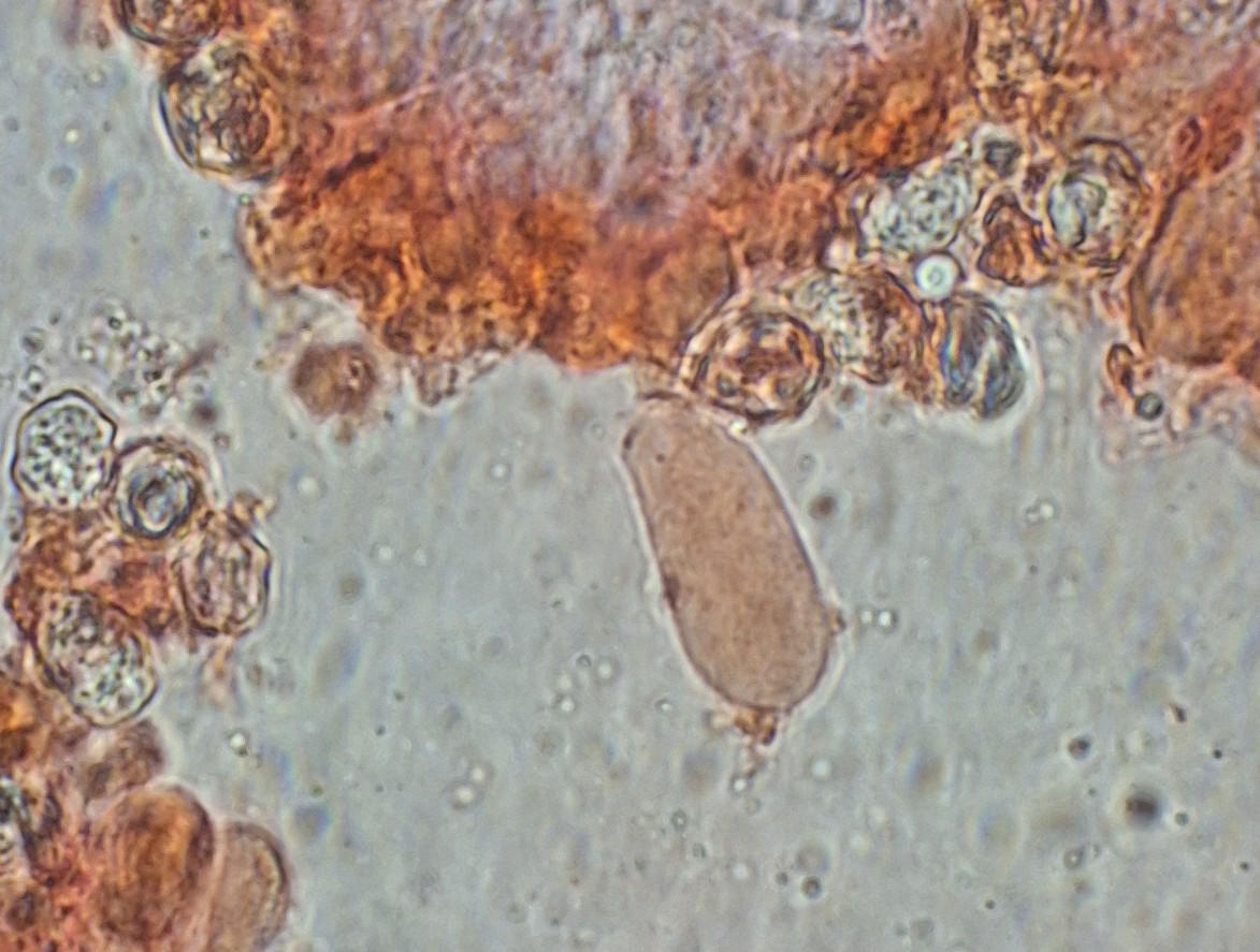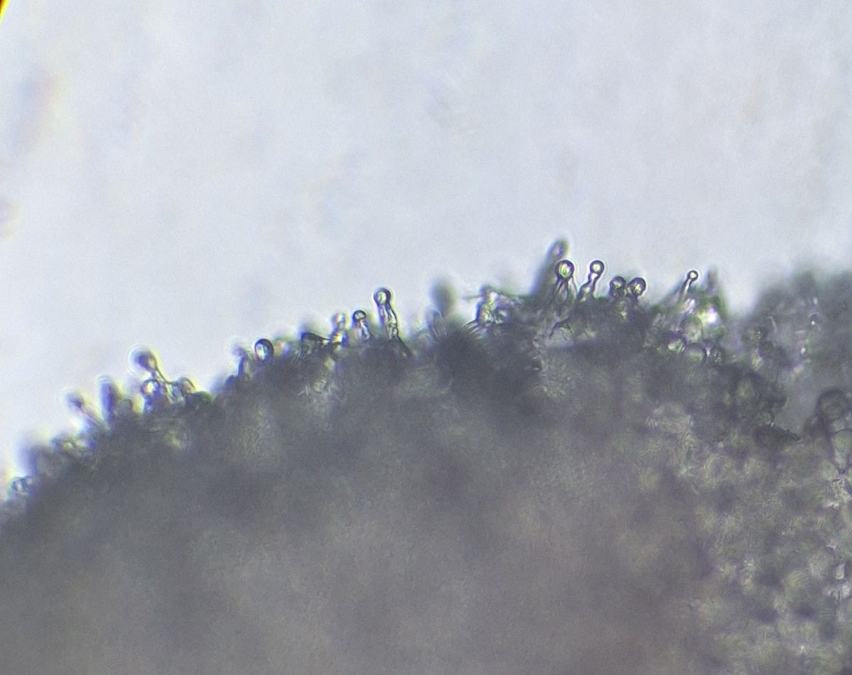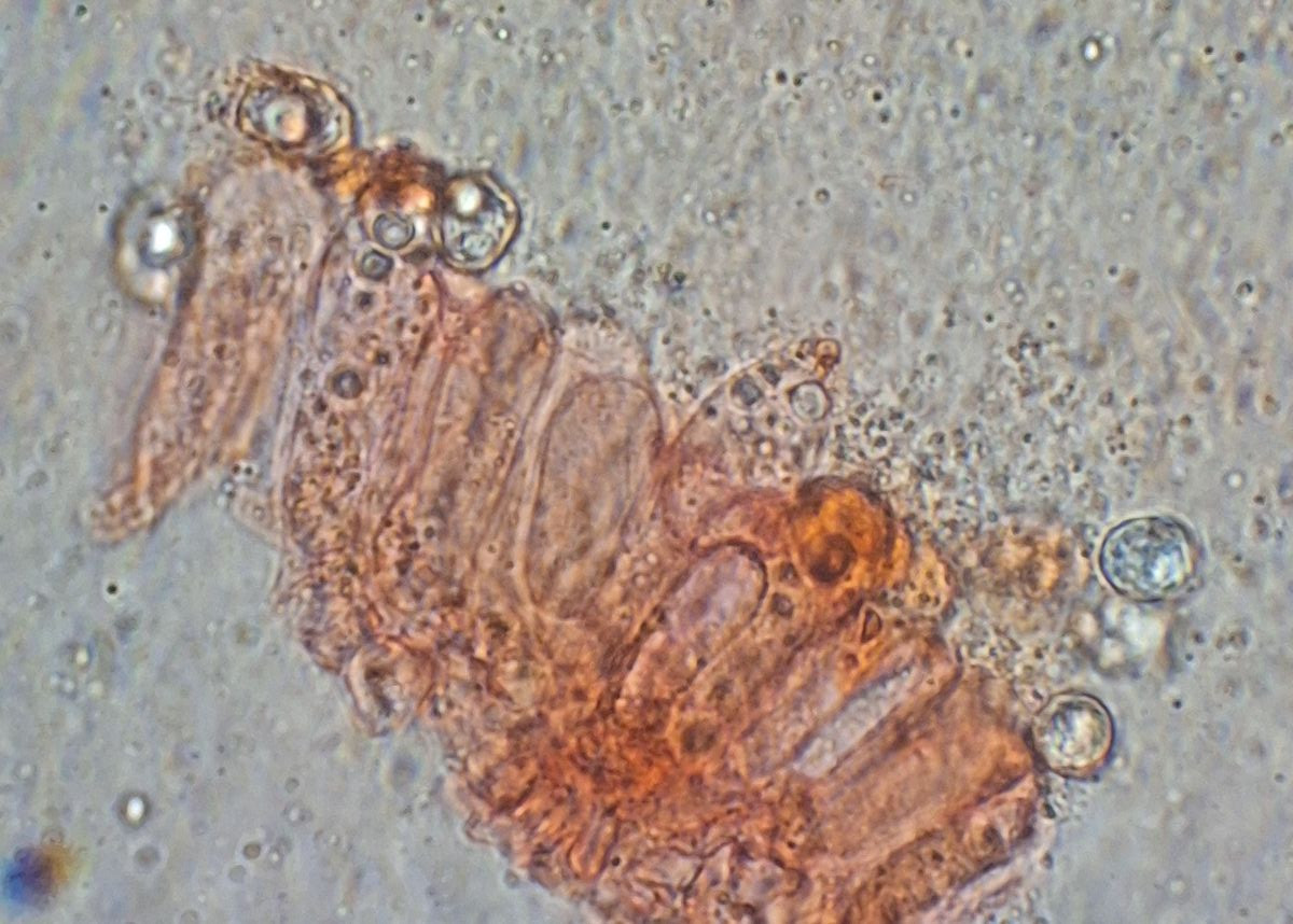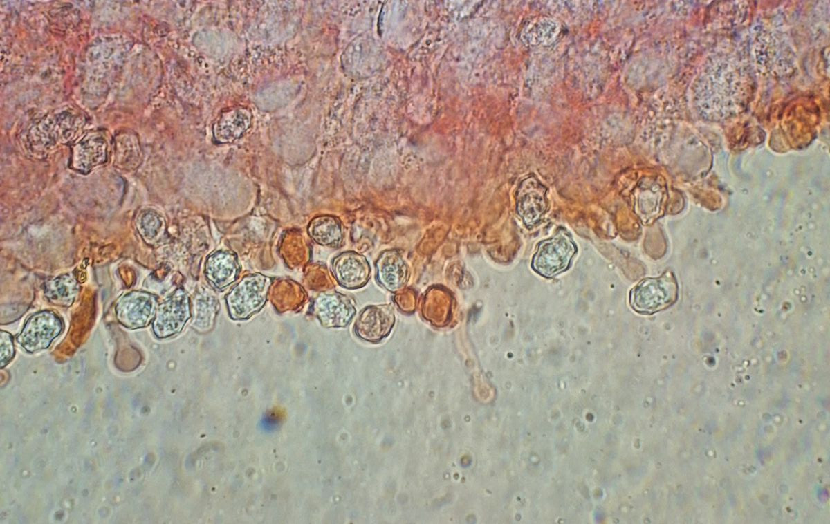 Lamelle des neuen Exemplars, Leptonienkörnchen, keine Schnallen, keine Cheilozystiden, jedenfalls keine, die anders als die Basidien aussehen, keine Schnallen gesehen