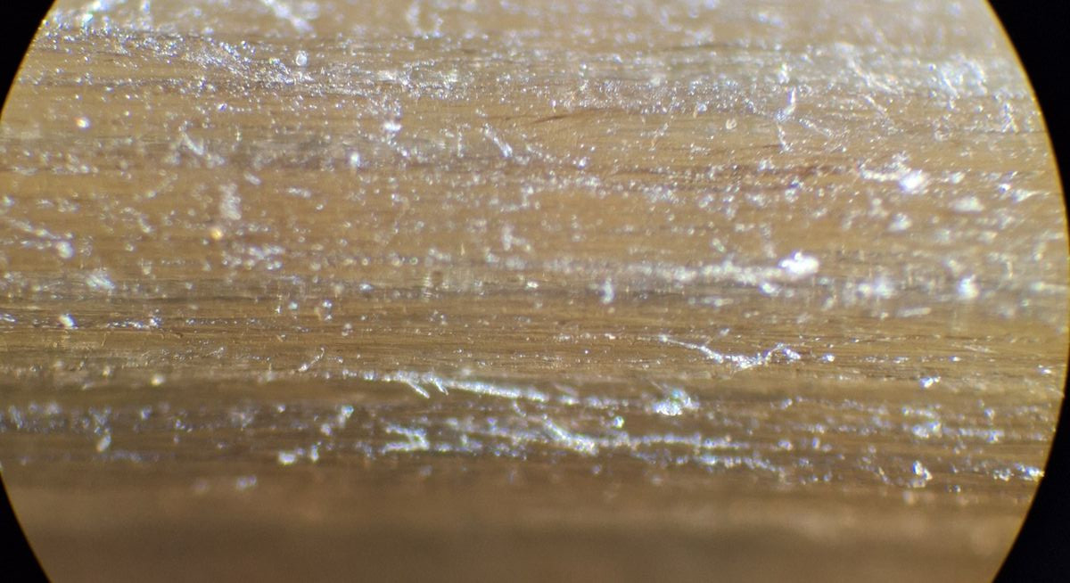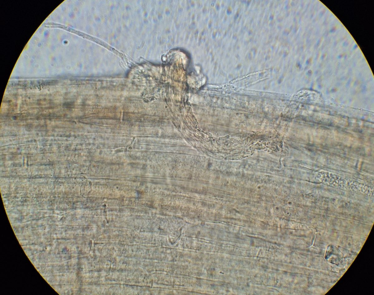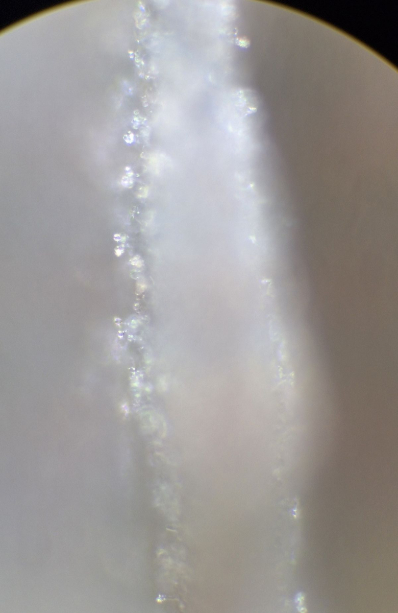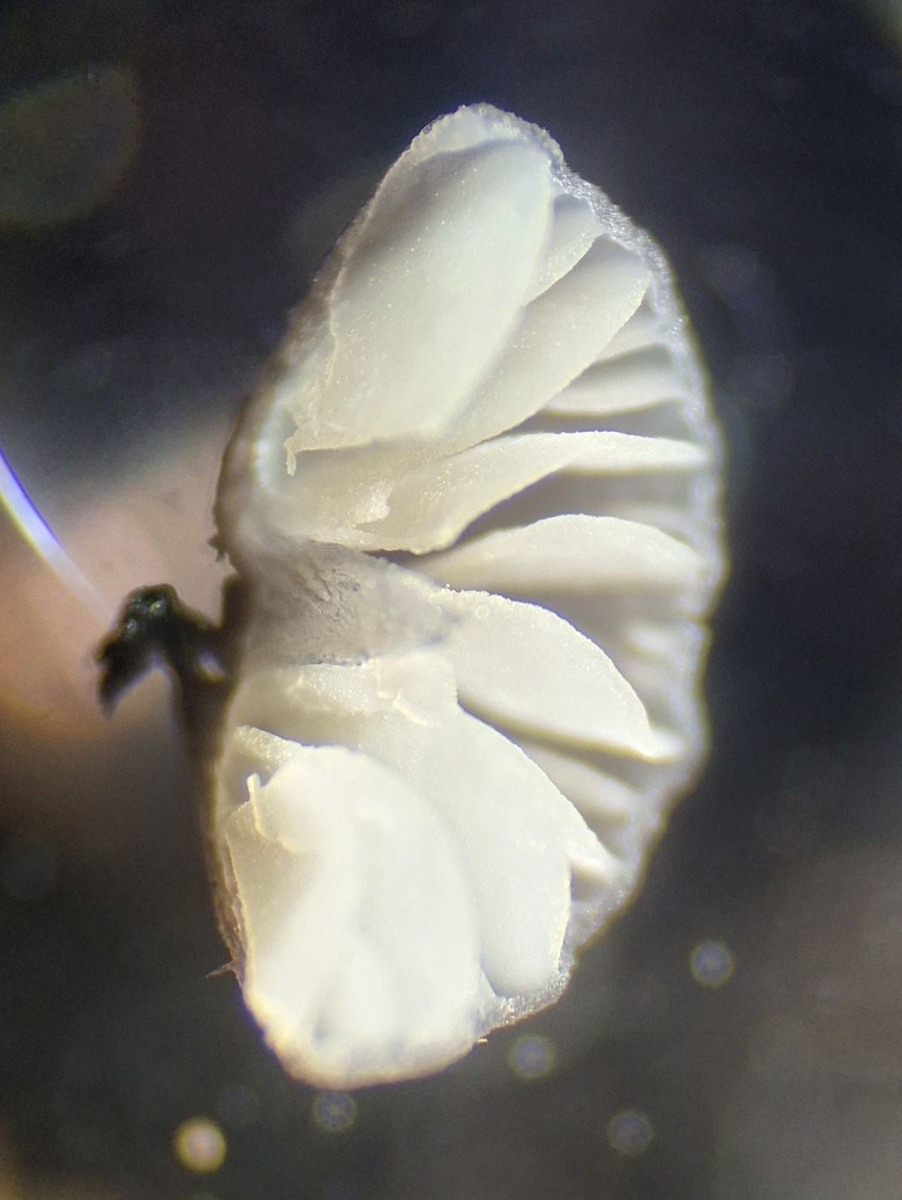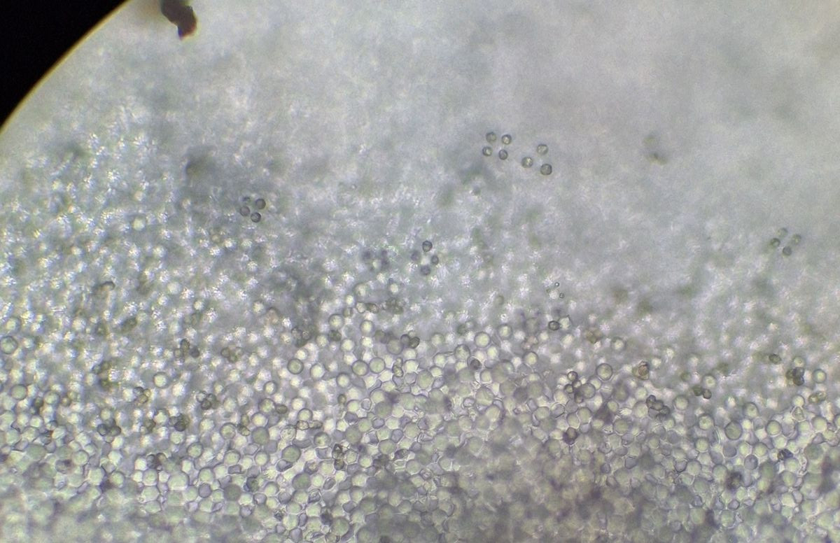 Lamelle des neuen Exemplars, Leptonienkörnchen, keine Schnallen, keine Cheilozystiden, jedenfalls keine, die anders als die Basidien aussehen, keine Schnallen gesehen