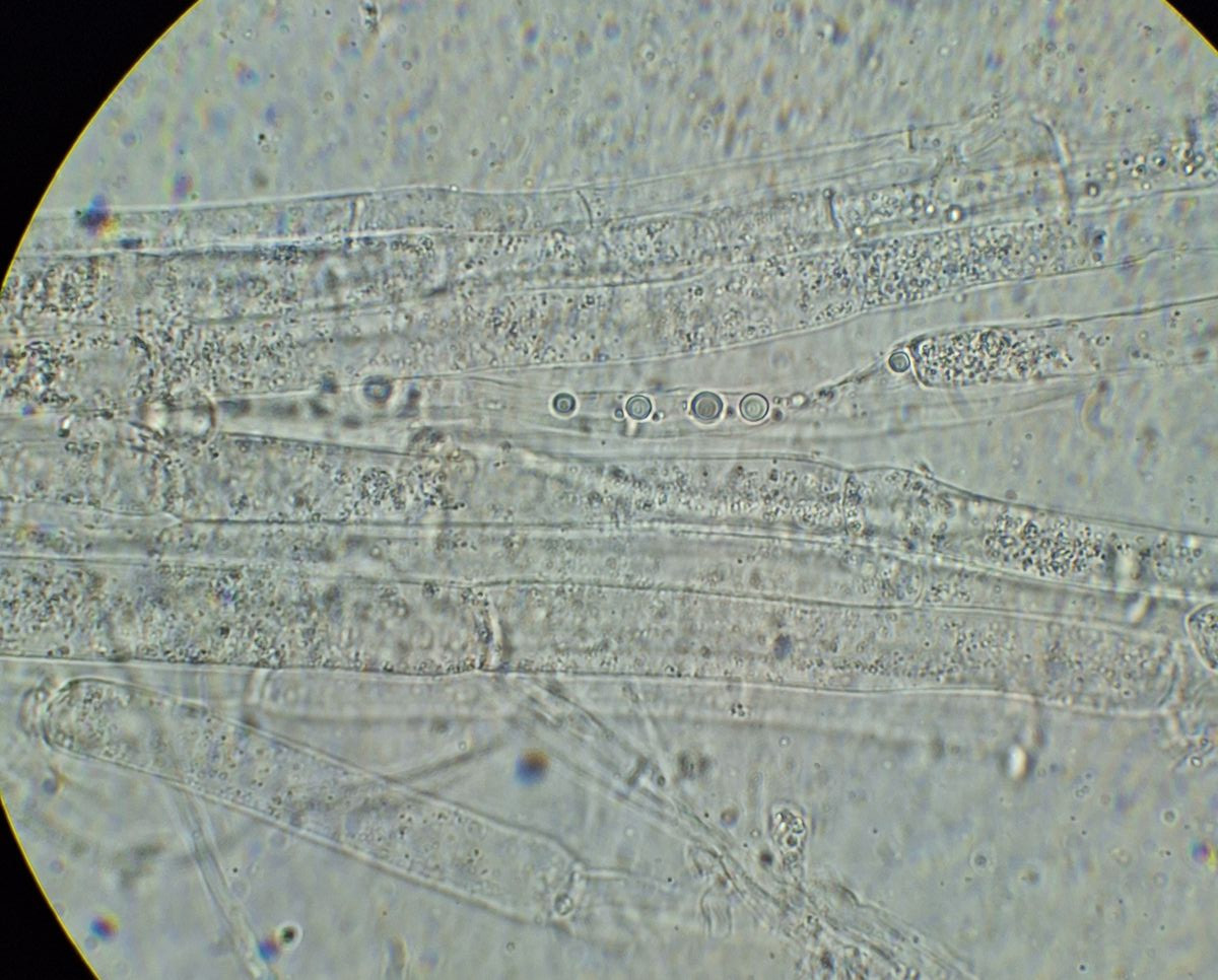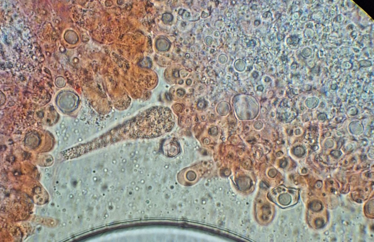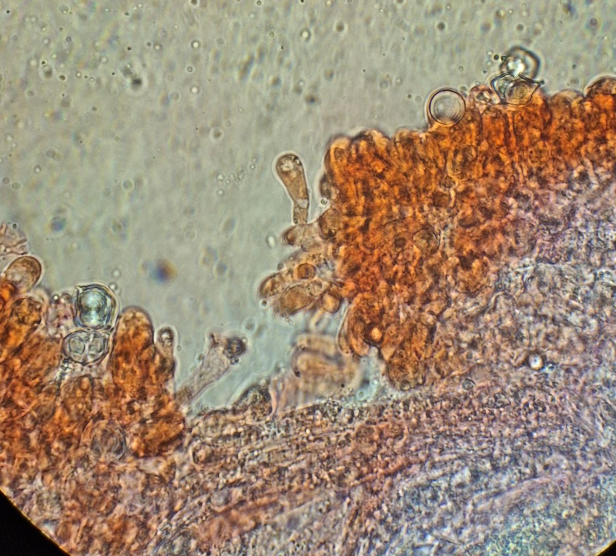 gestern spät abends hatte ich noch von dem kleineren der beiden Pilze, der auch angesichts hellerer Lamellen als etwas jünger erschien, ein Stück Lamelle untersucht. Da ich finde, dass die Cheilozystidien viel schneller kollabieren als Basidien, habe ich ein Stück aus Randnähe genommen - wo dann auch die kopfigen Cheilozystidien gar nicht zu sehen waren. Sauber separiert bekommen habe ich das nicht, aber soweit die Basis die Basidiolen erkennbar ist, sind die immer schon gerundet und nirgens nach Schnalle aussehend.
