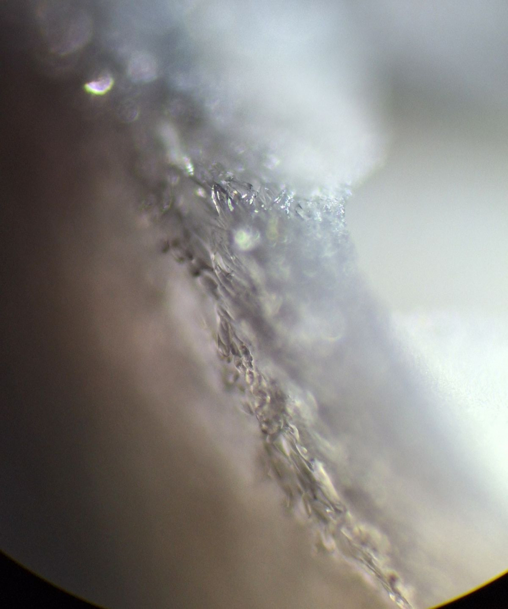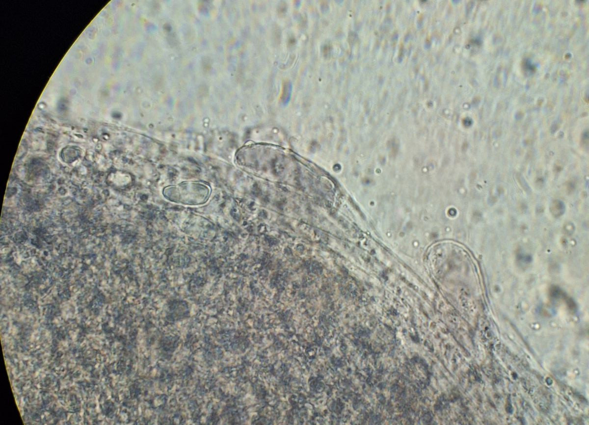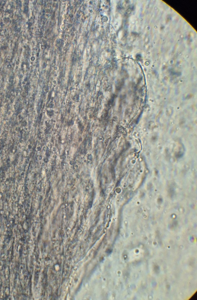 Lamelle des neuen Exemplars, Leptonienkörnchen, keine Schnallen, keine Cheilozystiden, jedenfalls keine, die anders als die Basidien aussehen, keine Schnallen gesehen