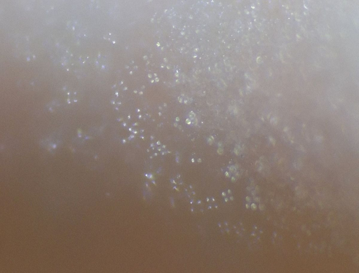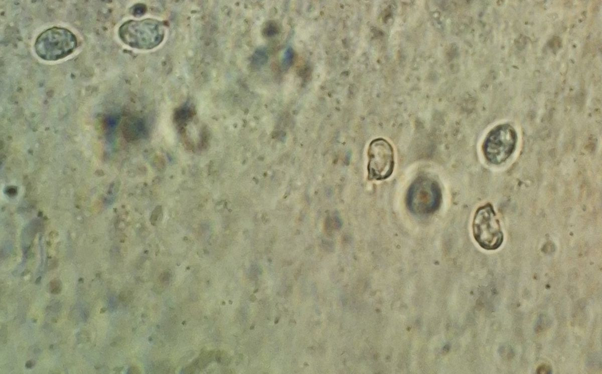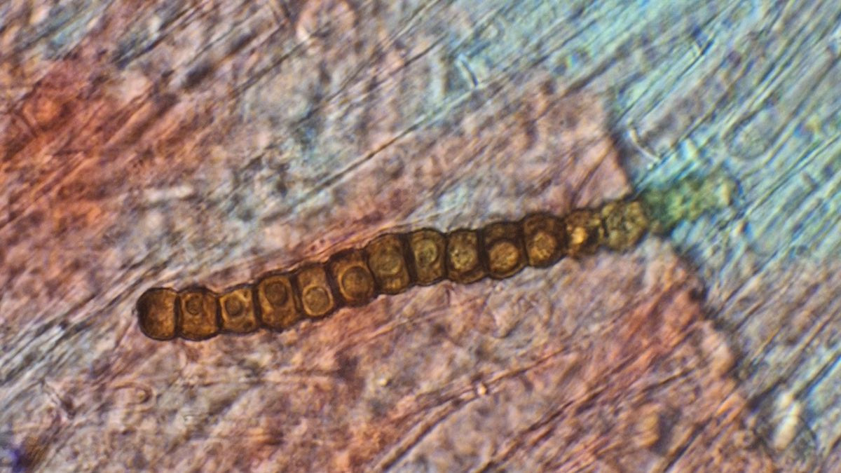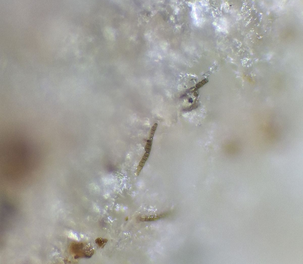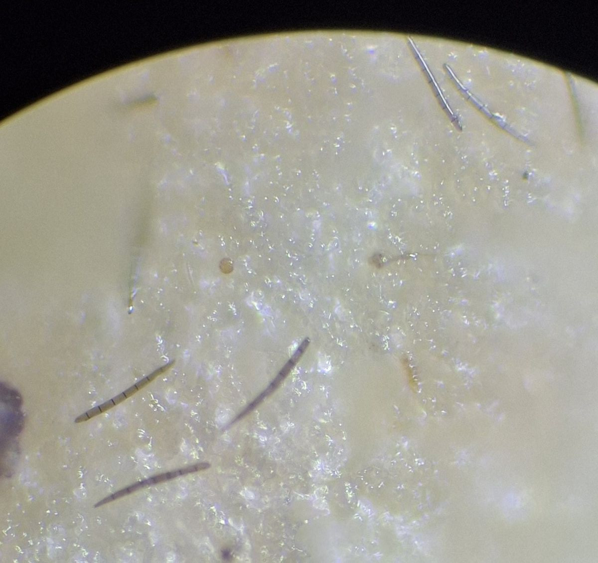 Im Auflicht kann ich nichts erkennen, ziemlich dreckig der Geselle und mit Fremdsporen belegt. Neben den normalen und zu erwartenden Geoglossum cookeanum gab es noch ähnlich gefärbte und ähnlich große, aber mit 15 Septen und an den Septen eingeschnürt. Die nachfolgend eingesammelten Erdzungen waren aber alle nicht der Verursacher