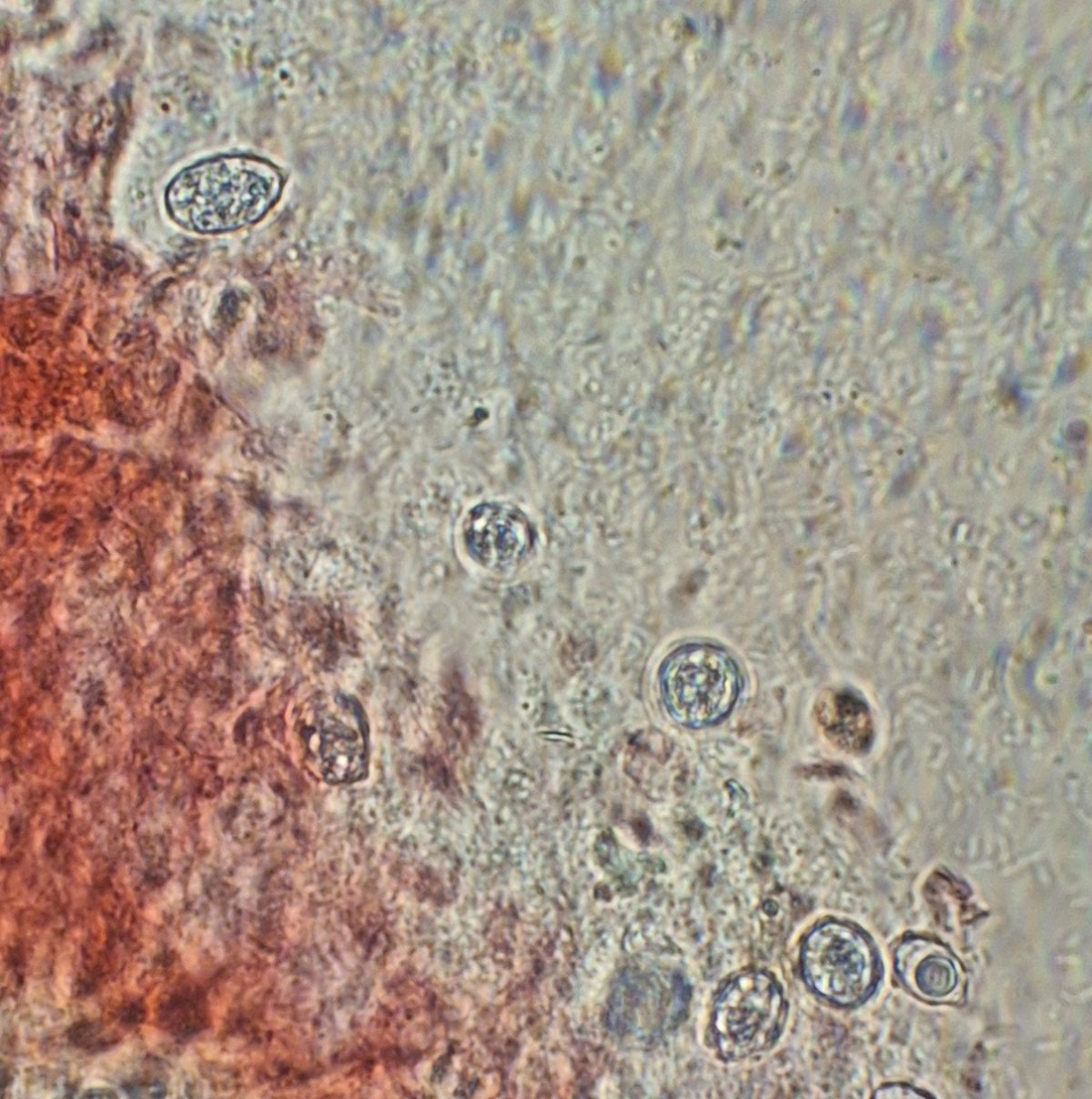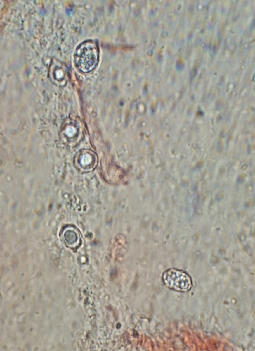 Sporen dickoval, stachelig, oft mit Apikulus, das rechts könnte eine Basidie sein, die wäre dann ohne Basalschnalle