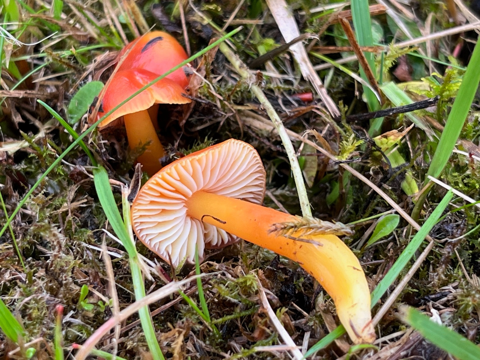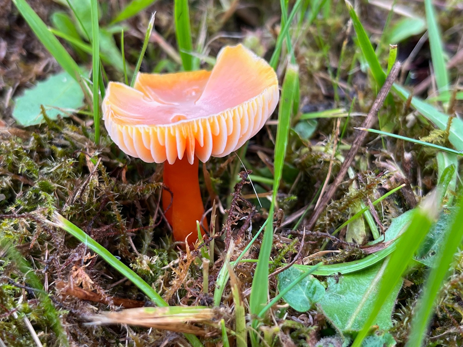 Etliche der Glänzenden Orangesaftlinge - Hygrocybe aurantiosplendens, die zu den treuen Begleitern der Wiese zählen, sind schon richtig groß. Den kann man schon von weitem bestimmen.
