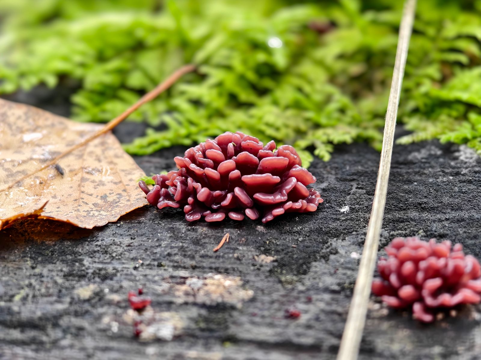 Auf einem Baumstumpf konnte ich dieses nette Makro-Motiv ausfindig machen. Picture Mushroom sagt Fleischroter Gallertbecher - nach Prüfung stimme ich dem zu. Der Fleischrote Gallerttrichter hat sich übrigens auch gezeigt, allerdings schon recht durchgenudelt und kein Foto mehr wert.