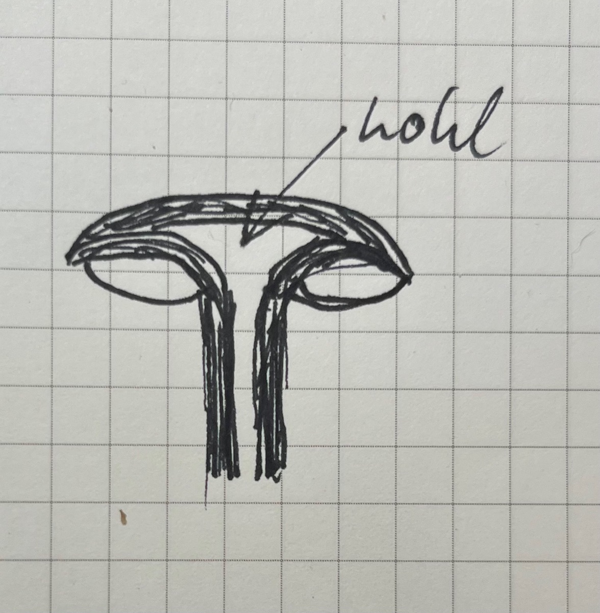 Stiel: 4,5 cm x 3 mm faserig gerieft, hohl bis in den Hut hinein, dort eine auffällige Hohlkammer bildend.