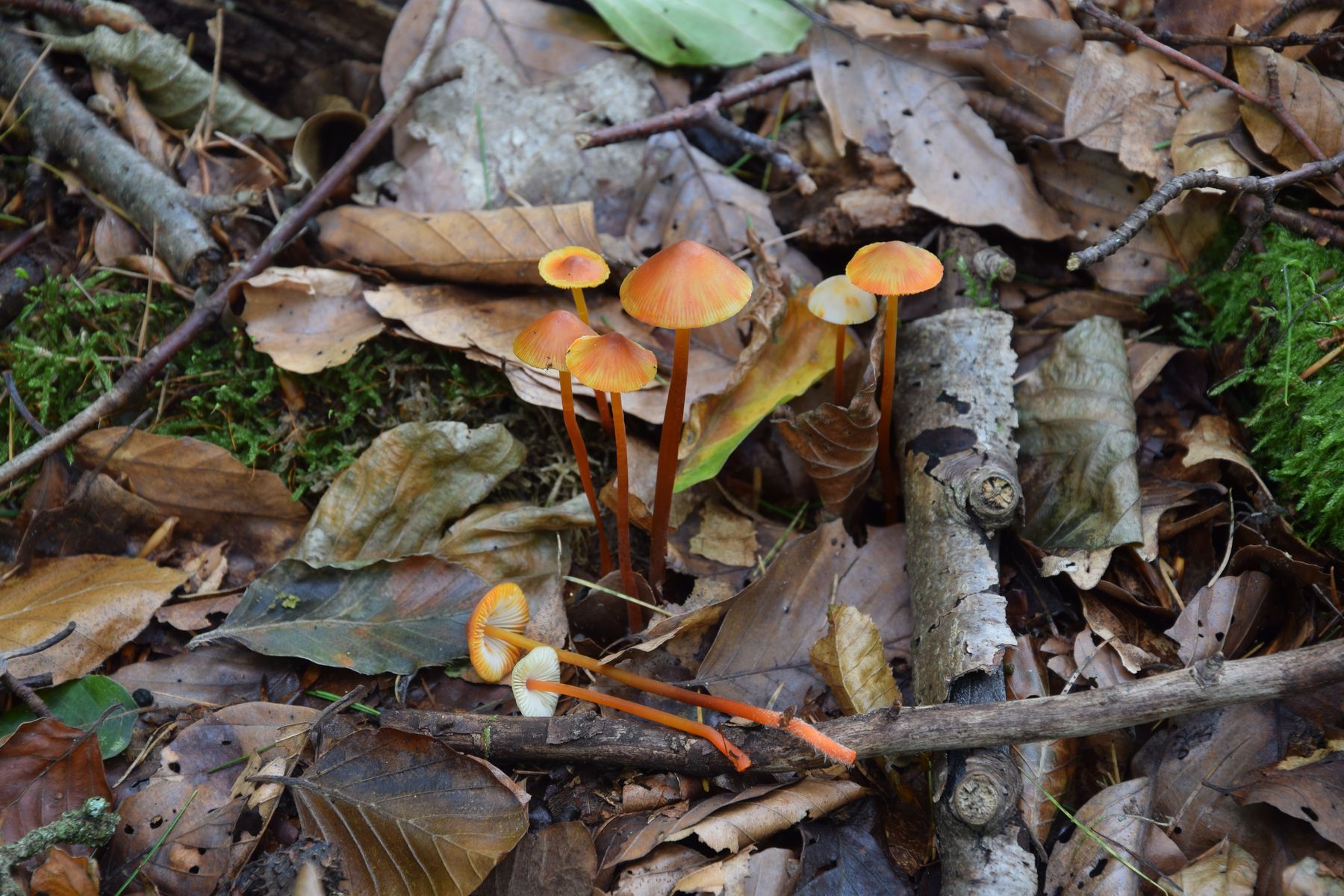 Und weil sie so schön sind, eine Kollektion Orangemilchende Helmlinge (Mycena crocata).