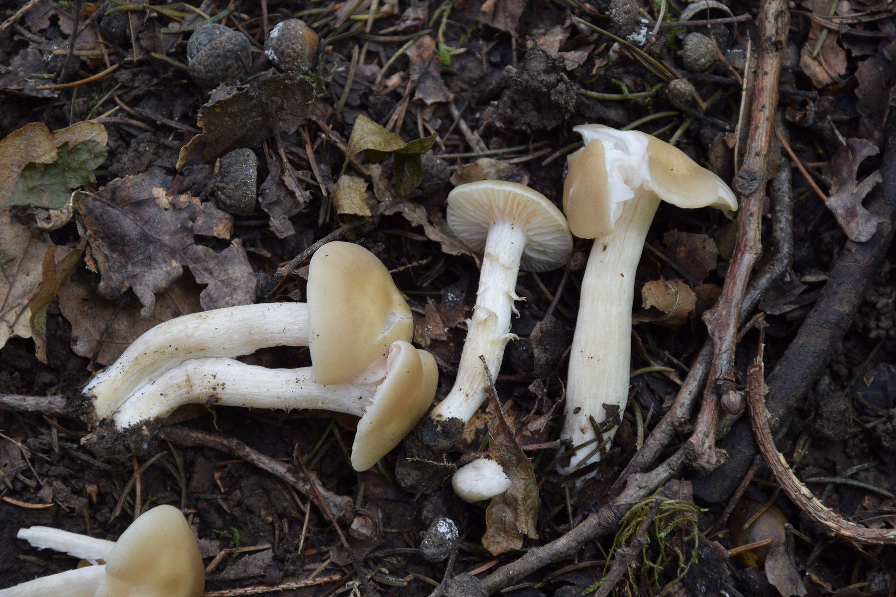 Unweit davon (Waldrand) fand ich diese vermutlich verirrten Nitratsaftlinge (cf. Neohygrocybe nitrata). Ich habe sie erst für Lyophyllum oder Entoloma gehalten, sie sind auch recht festfleischig/knorpelig, aber mit stark nitrösem Geruch bleibt nur einer der beiden Nitratsaftlinge übrig, oder? So wirklich zufrieden bin ich mit der Benennung allerdings nicht. Interessanterweise ist der Nitratgeruch zu Hause inzwischen völlig verschwunden und sie riechen jetzt angenehm aromatisch. Ein Röten war bisher noch nicht feststellbar. Wie lange würde es bei N. ingrata dauern? Ist das deutlich oder eher so ein Perlpilz-Röten? Ich lasse sie sicherheitshalber nochmal absporen (gibt es Rötlinge oder Raslinge mit einem solchen Geruch?)