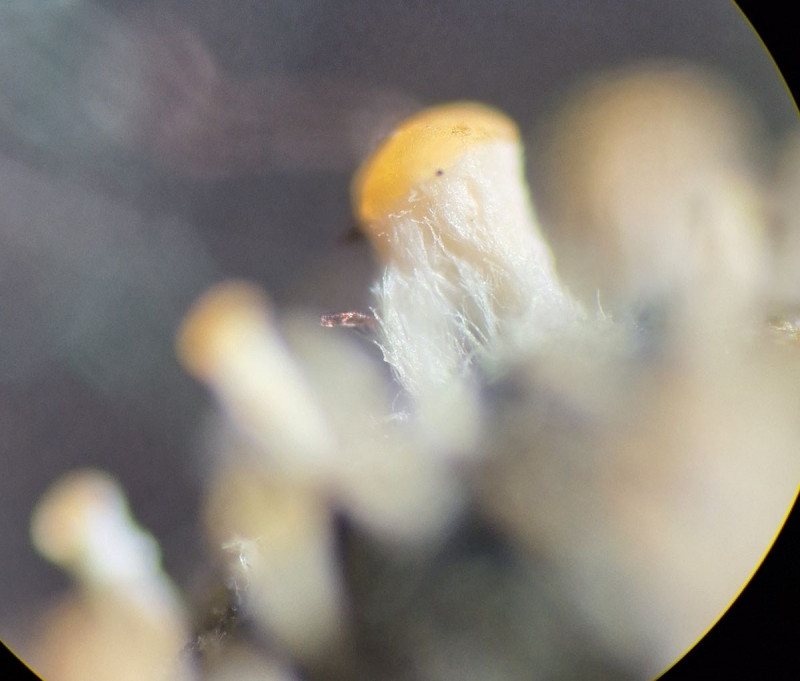 Unterm Mikroskop, bin leider nicht gleich dazugekommen, war der glasig-farbige Kontrast der linken Exemplar nicht mehr zu sehen. Und die filzigen Stiele passen nicht zu Pilobolus.