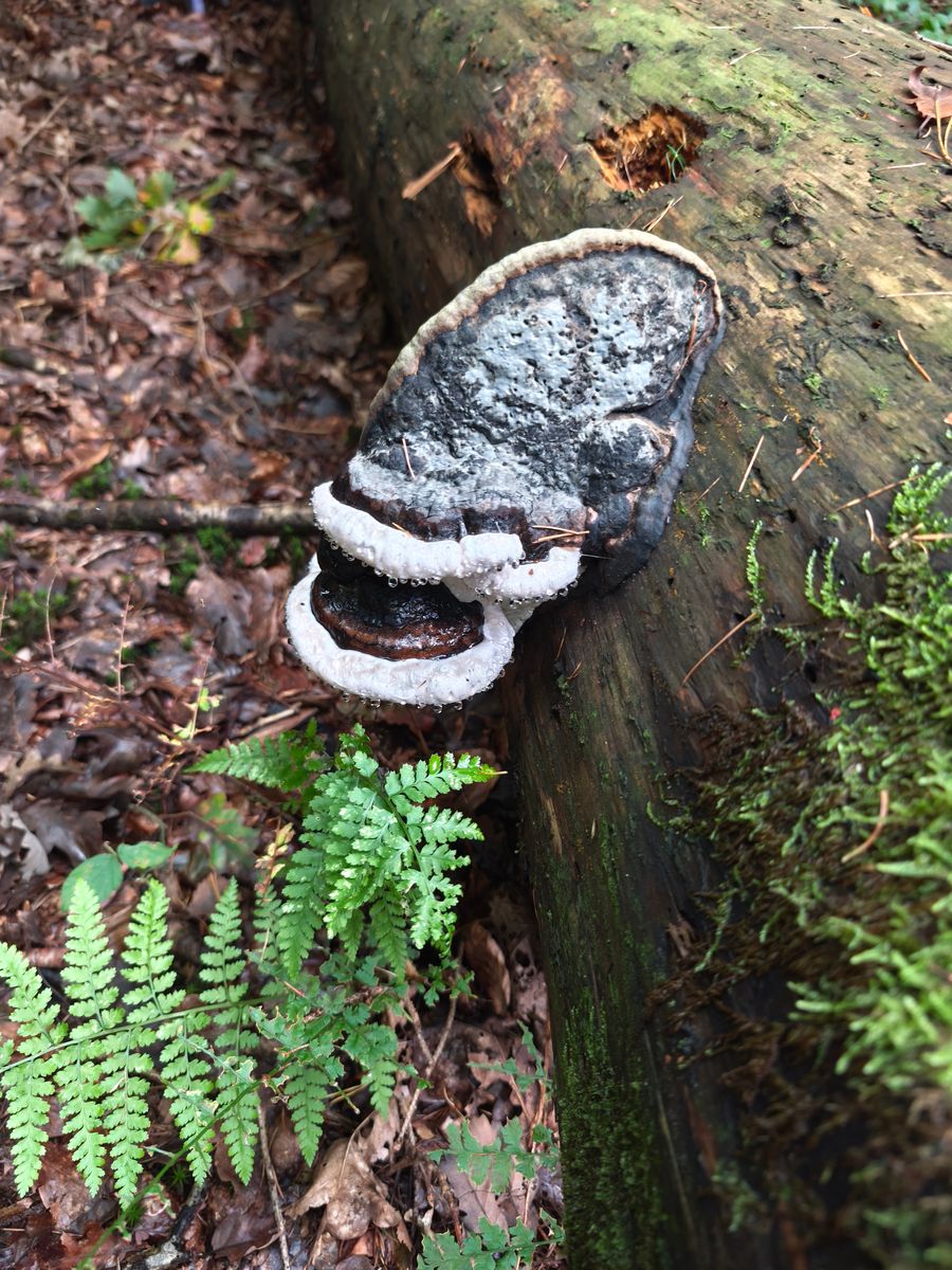 es könnte(!) der Rotrandige Baumschwamm sein. Der Pilz wuchs bereit am lebenden Baum und als der Baum umfiel, wuchs er eben weiter, indem er sich erneut geotropisch ausrichtete (Poren nach unten).