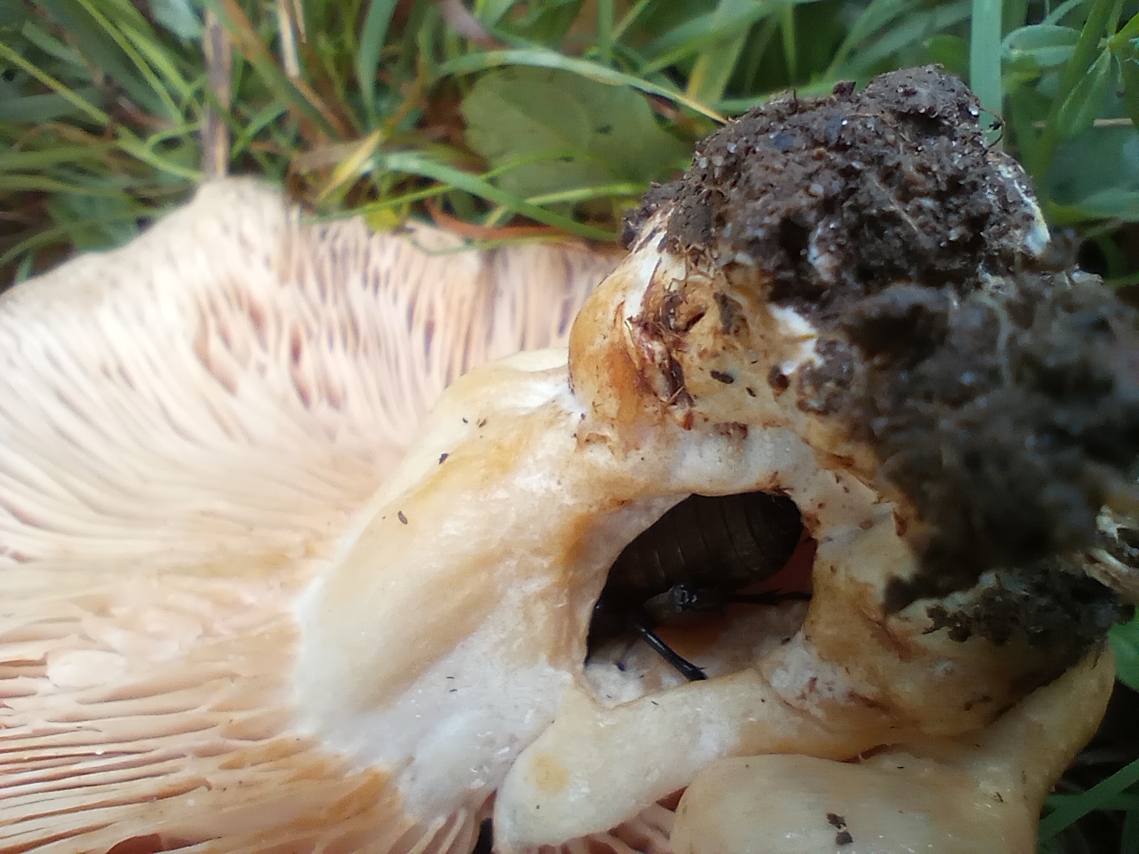 bei dem ich eine Feldgrille vermute. Ob die sich da versteckt oder sich mit dem Pilz den Bauch vollschlägt? Mein ursprüngliches Ziel, den Pilz einzugrenzen habe ich dabei aus dem Auge verloren, weitere Daten habe ich nicht erhoben. Gemilcht hat er jedenfalls nicht. Eiche und Walnuss kommen als Symbiosepartner in Frage. Vielleicht hat ja jemand 'ne Idee, auch zu der Grillenfrage.