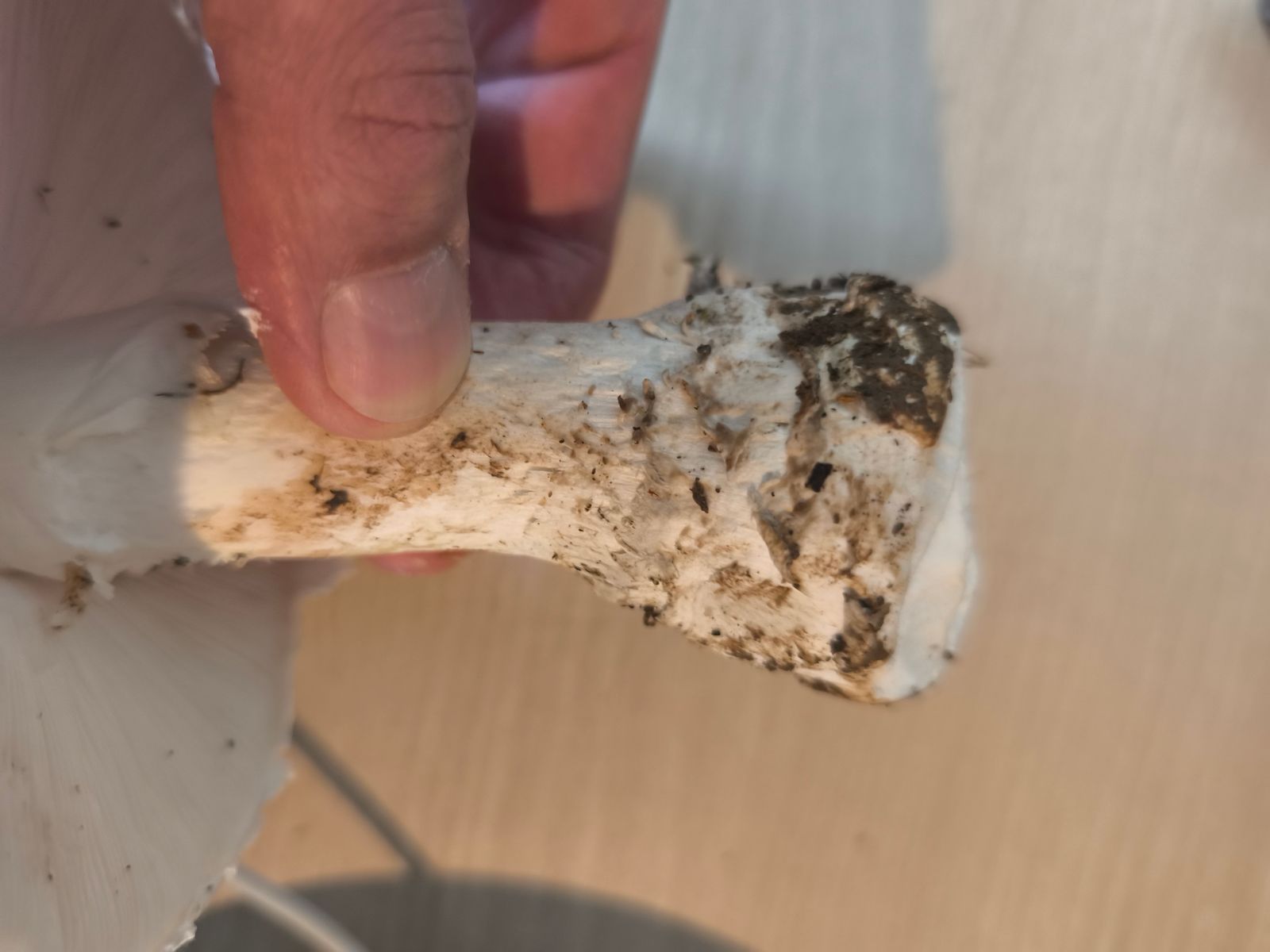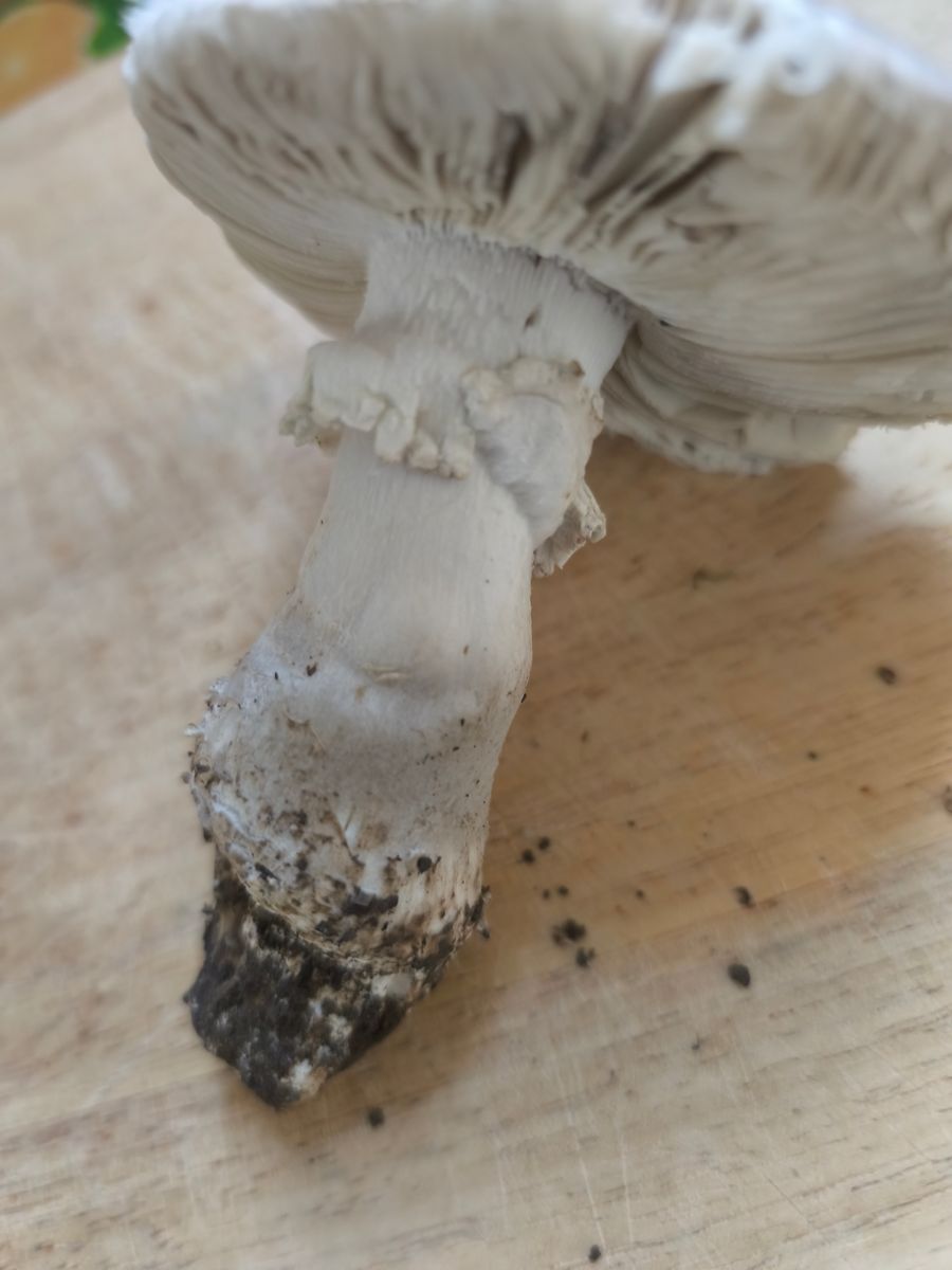 Etwas dürftig die Information, war der Ring gerieft? Welche Form hat die Knolle? Pilze sind keine Pflanzen und haben keine Wurzel. Das nennt sich Stielbasis! Also, wenn möglich, bitte noch Fotos nachreichen.