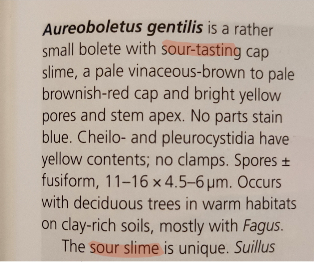 • (Der Schleim des zuerst angedachten Aureoboletus gentilis sollte angeblich (FotE) sauer schmecken)