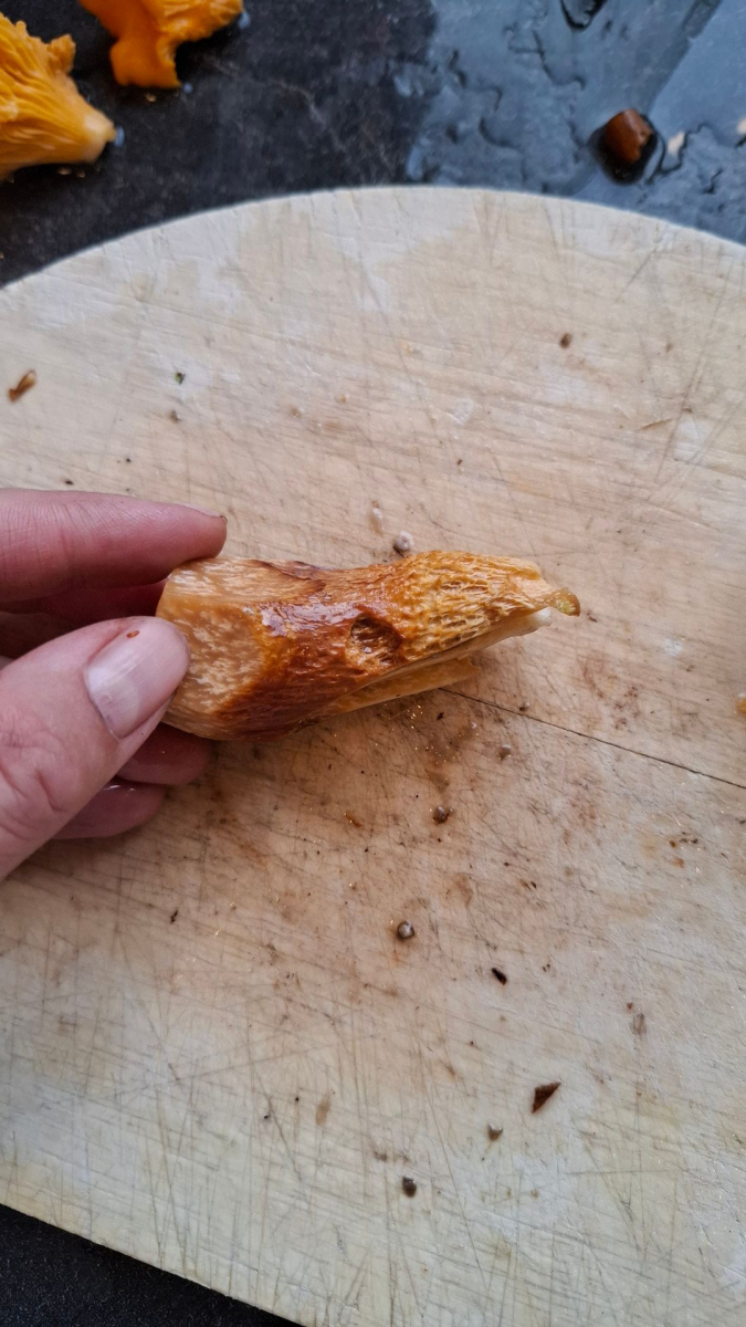 Da ich sehe, das ist dein Küchenbrettchen, und Messer, Gurke und ein Pfifferling liegen auch schon parat: Als Speisepilz könntest du diesen sowieso nicht mehr nutzen, da er schon am Rande von verdorben ist.
