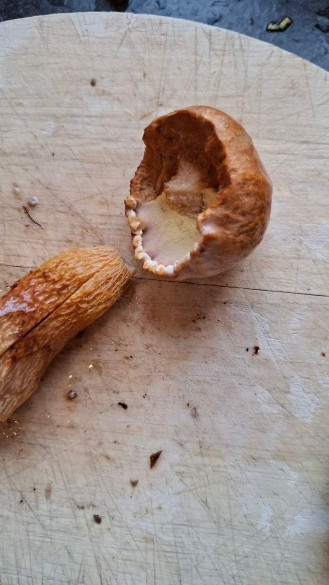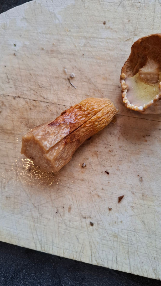 Diesen hatte ich mir zur Seite gelegt und ihn dann (zuletzt) aufs Brett geholt, aufgeschnitten und begutachtet. Er sollte nicht in den Beutel, auch wenn er an für sich ein helles Schwämmchen hat. Er ist auffällig und ich wollte letztlich gern wissen, ob es ein schmackhafter Speisepilz ist und wird den Ort noch mal aufsuchen sollten🙃