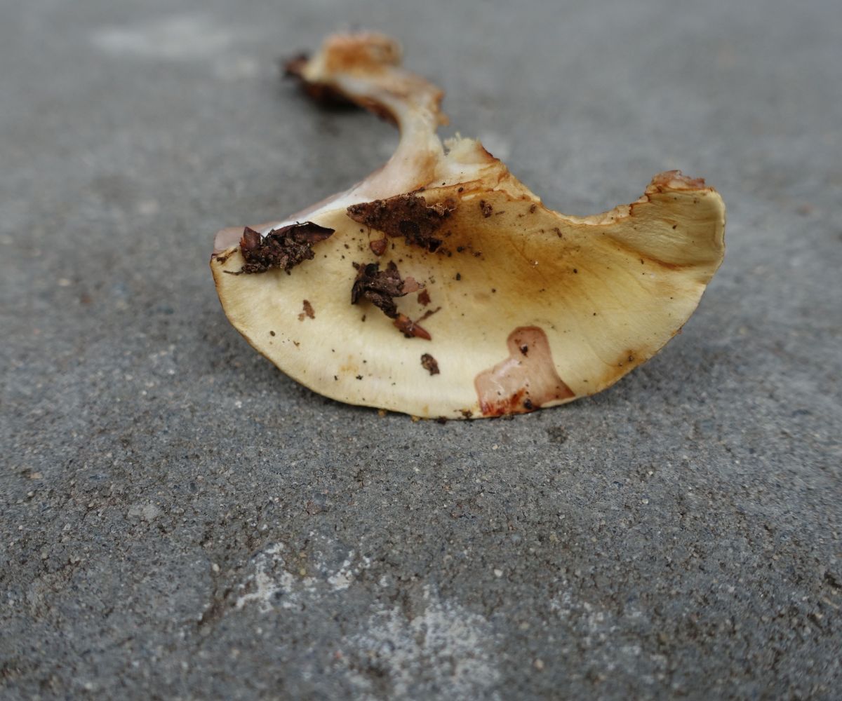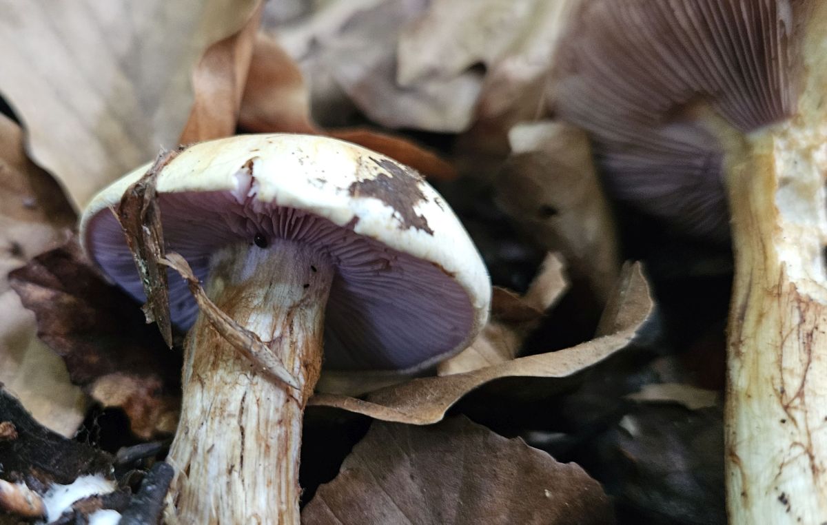 Die der Fund einen hellgelblichen Hut, jung auffällig farbenfroh lila gefärbte Lamellen. Stiel mit abgesetzter Knolle, deren weitere Eigenschaften kaum bewertbar sind weil zu alt bzw. abgefressen. Geschmack der Huthaut nicht bitter. KOH reagiert auf dem Hut relativ träge innerhalb einiger Minuten zu einem doch recht lebhaften erdbeer-rosa; im Knollenfleisch kann man wegen der heftigen Fraßspuren eine rosaliche Reaktion nur erahnen. Sporen siehe Bild, Maße 9,0..9,2..10 x 5,0..5,3..6,0; Q = 1,72.