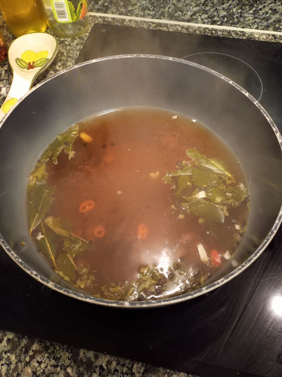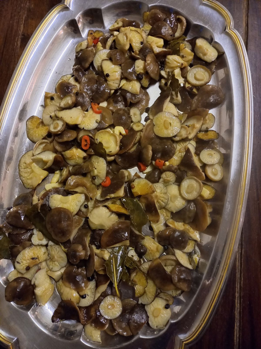 Für ca. 1 Kg Pilze: 600 ml Wasser, 600 ml Weißwein, 600 ml Essig, ca. 1 Esslöffel Salz, 4 Knofis, Pfefferkörner, 4 Lorbeerblatt, ein paar Wacholderbeeren, Prise Thymian, Prise Estragon, Prise Origano, Chili