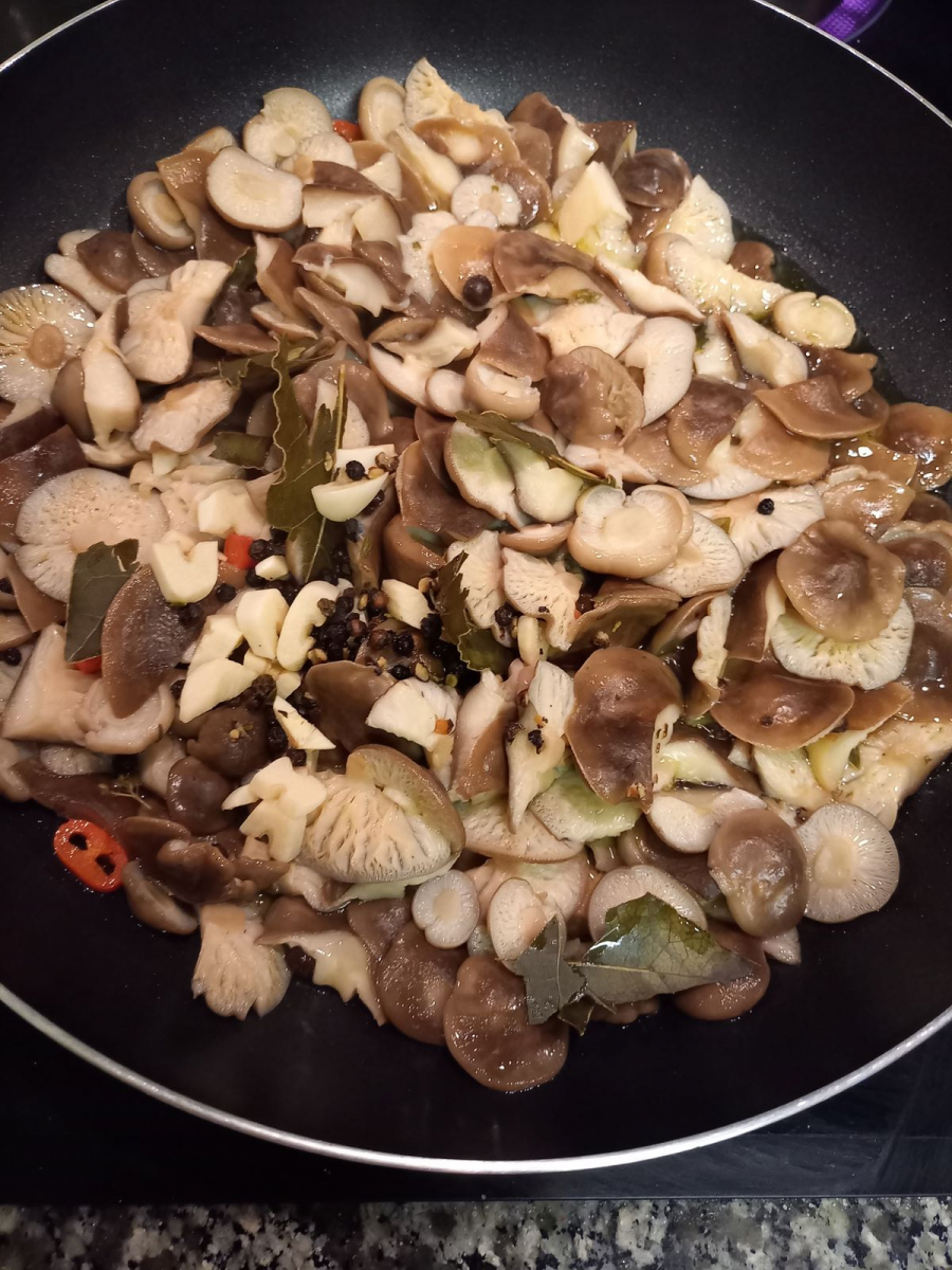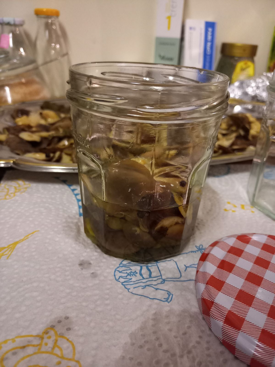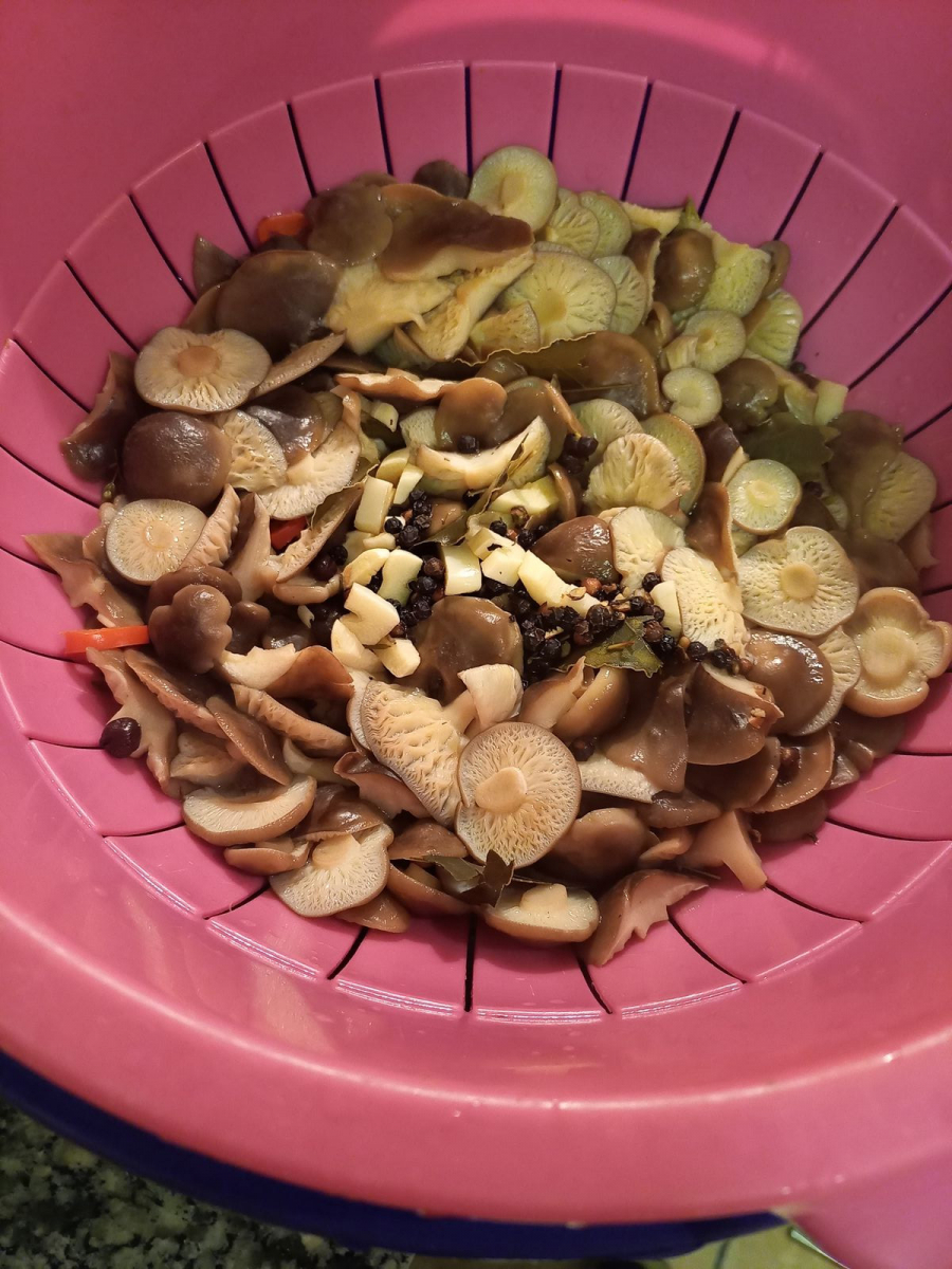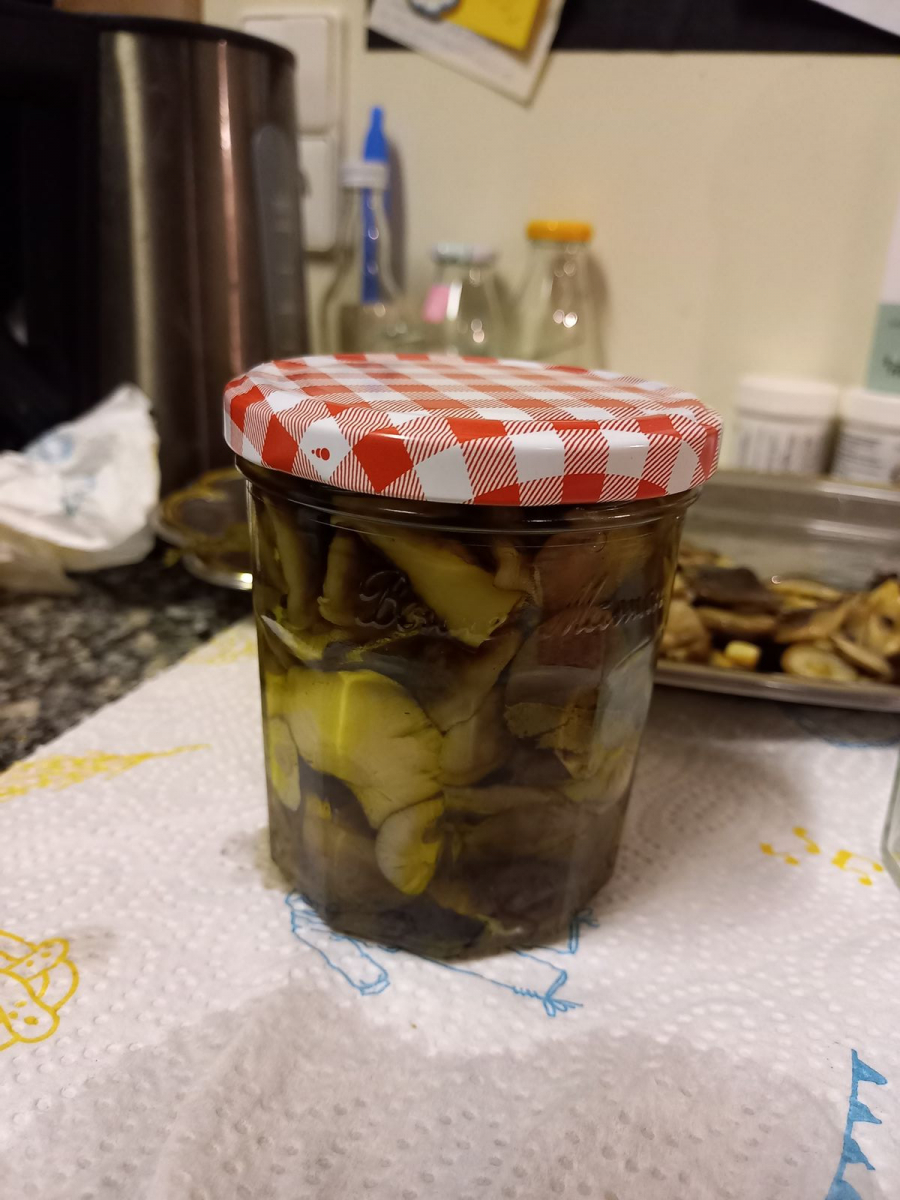 Wenn noch genügend Flüssigkeit vorhanden ist und man noch andere Pilze einmachen möchte (Hallimasch z.Bsp) kann man natürlich die Flüssigkeit auffangen und neue Gewürze hineintun.