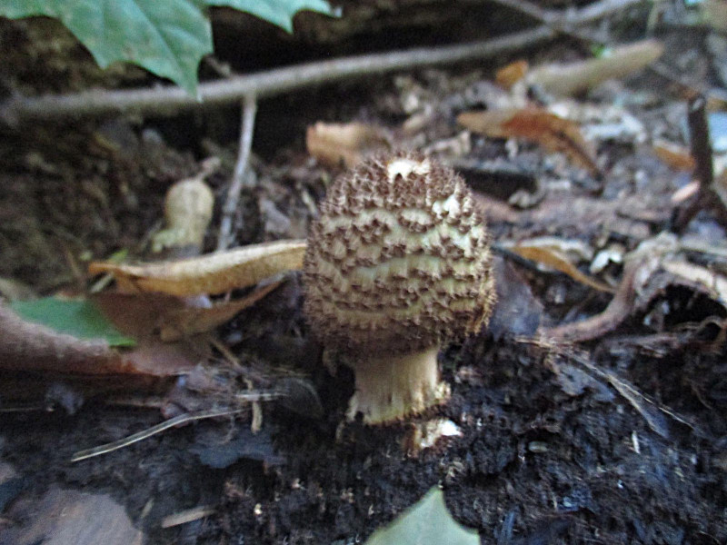 Gleich neben dieser lugte ein Rauer Stachelschirmling aus dem Laub.