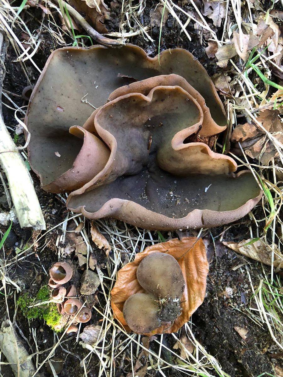 Bei dem Becherling habe ich mal den kastanienbraunen Becherling als Verdacht, aber das scheint schwierig zu sein ohne Mikroskop.