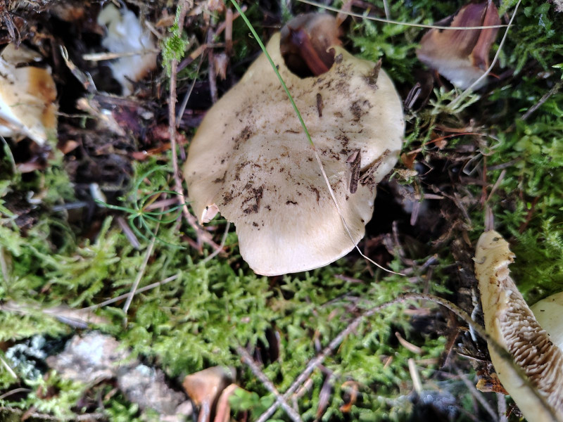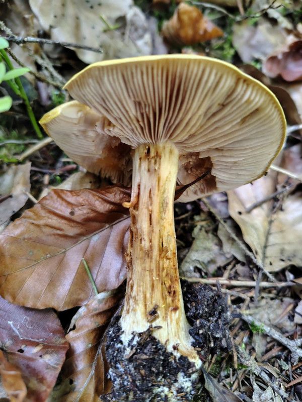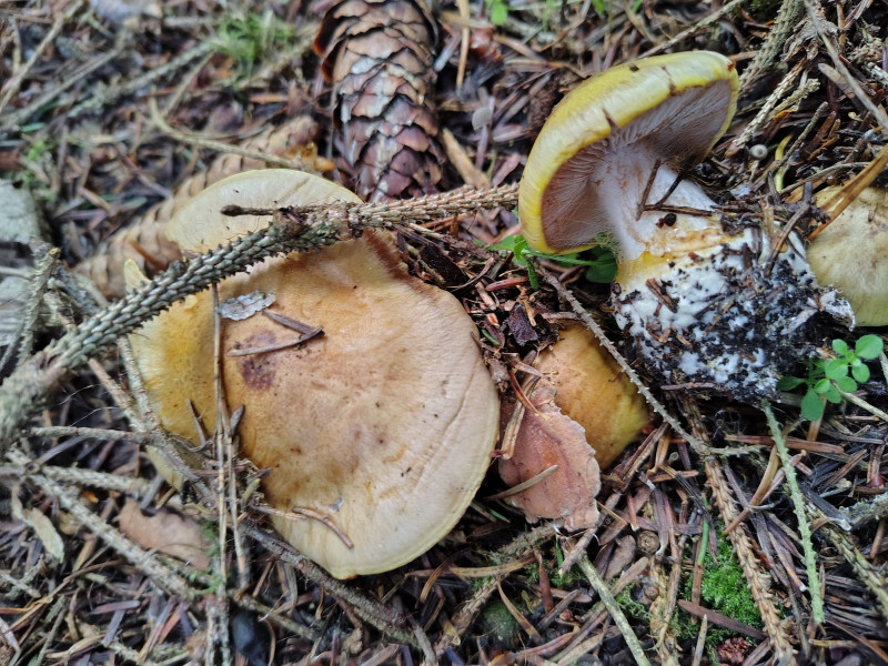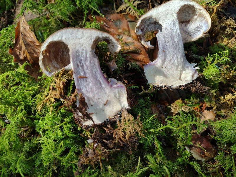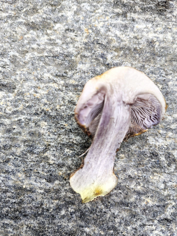 Ebenfalls reiner Nadelwald, viel Violett am Stiel und den Lamellen. Olivfaseriger Hut, gerandete Knolle. KOH überall negativ. Sah bisschen aus wie C. magicus im Nadelwald. Extrem auffällig war allerdings der absolut unverkennbare Mehlgeruch und -geschmack. Gar keine Ahnung wo hin damit, ich finde nur C. dionysae. Da Cortinarius aber neulich nach einer Geschmacksprobe nach Mehl gefragt hat, denke ich, dass es da was geben muss?