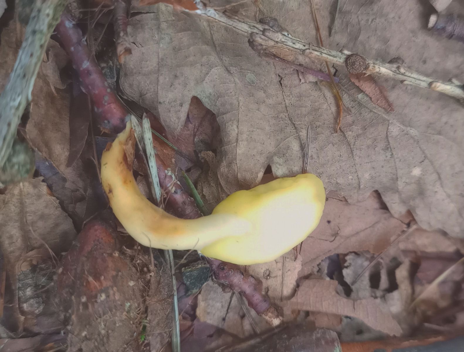 ich habe heute auf etwa 300 Metern im gemischten Laubwald ( Buchen/Eichen) mit einzelnen Lärchen 2 Fruchtkörper gefunden, von denen ich vermute, dass es Spatelinge sind. Der Boden eher kalkhaltig/Molasse. Die Bilder sind furchtbar, mein Smartphone überstrahlt Gelbtöne. Literatur habe ich keine mitgenommen, Bildvergleiche im Netz lassen mich Ledergelber Spateling vermuten, v.a. wegen der Stielfarbe. Kann das hinkommen? Der Dottergelbe hat einen weißen Stiel? Sachdienliche Hinweise nenne ich gerne entgegen, vielleicht geht ja trotz der sch...lechten Bilder was. Danke und