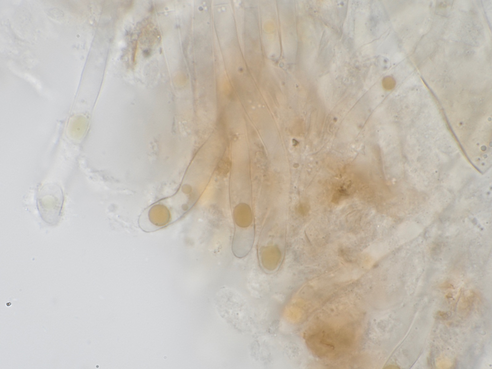 ich habe kürzlich bei Springe in Niedersachsen an einem Bach (direkt am Rand des Baches auf Erdboden) einen Becherling gefunden, den ich leider nicht bestimmen konnte. Ich gehe davon aus, dass es sich um eine Peziza handelt. Die Asci reagieren in Baral blau. Die Paraphysen haben ganz auffällige braune Tropfen im innern. Das Apothecium schien mir neben dem Dunkelbraun einen leichten lilastich zu haben. Die Sporen messen 16-17 Mikrometer mal 10-11 Mikrometer und haben relativ große runde Warzen, die unterschiedlich groß sind. Fotos siehe anbei.