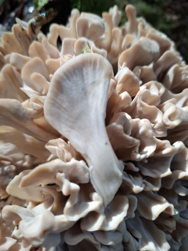 1. Schon lange nicht mehr gesehen und mich gewundert, dass diese Breitblättrige Glucke (Sparassis Brevipes) es sich am Fuße einer Weißtanne gemütlich gemacht hat: