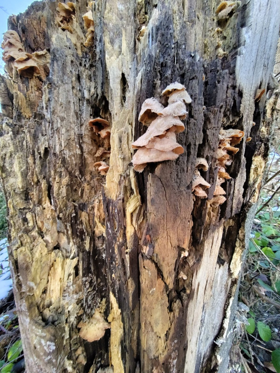 Die noch recht jungen Fruchtkörper schauen zungenförmig (aber eigentlich stiellos) aus den Löchern im morschen Stamm hervor :)