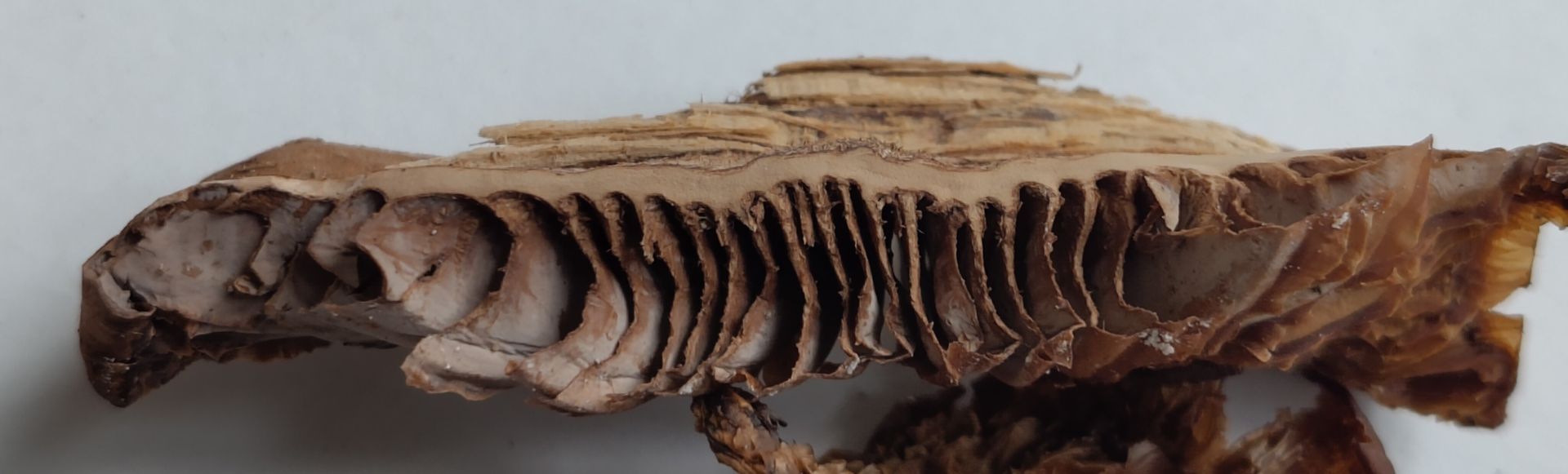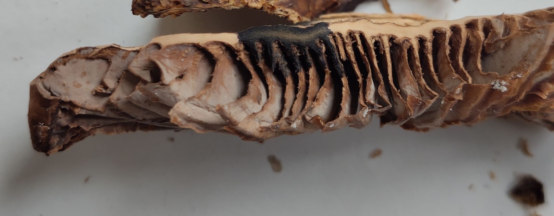Der getrocknete Querschnitt zeigt schön die "Ligne noire" zwischen Hutfleisch und Lamellen.
