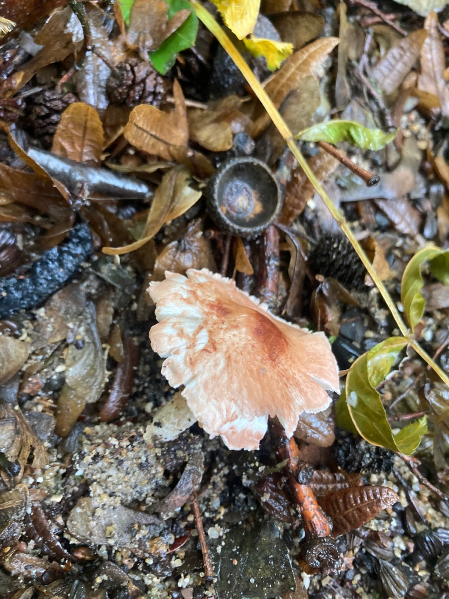 1. In einem Park fand ich unter Eichen und Hainbuchen im Laub diesen rötlichen Schirmling, etwas gebuckelter Hut, freie weiße Lamellen, am Stiel nicht mehr wirklich ein Ring auszumachen, unterer Teil zur Basis hin irgendwie schwach rot flockig/ schuppig/ rauh. Den Geruch assoziierte ich mit aromatisch, kräftig aber nicht wirklich angenehm. Es käme lepiota subincarnata in Frage, der fleischrosa Schirmling. Er soll ja Amanitin enthalten.