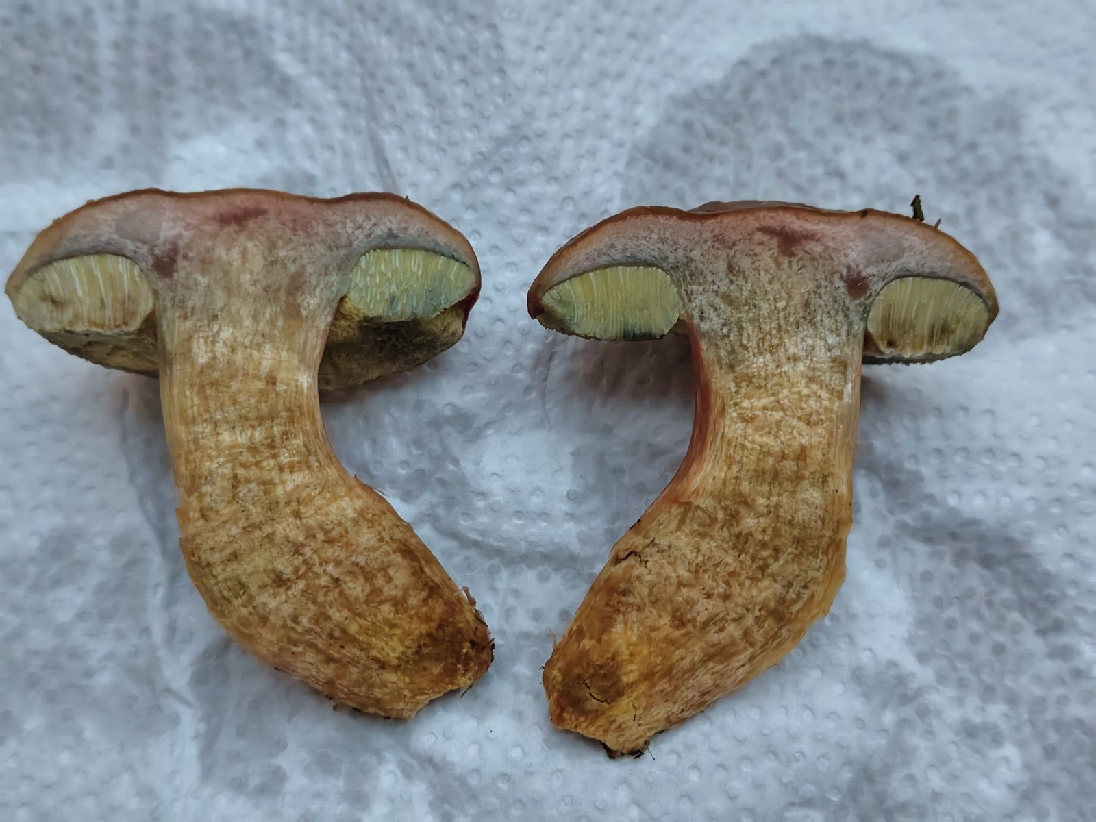 Fleisch: Gelbbraun, Hutfleisch heller, nur oberhalb der Röhren blauend, rötliche Zone unter der Huthaut.