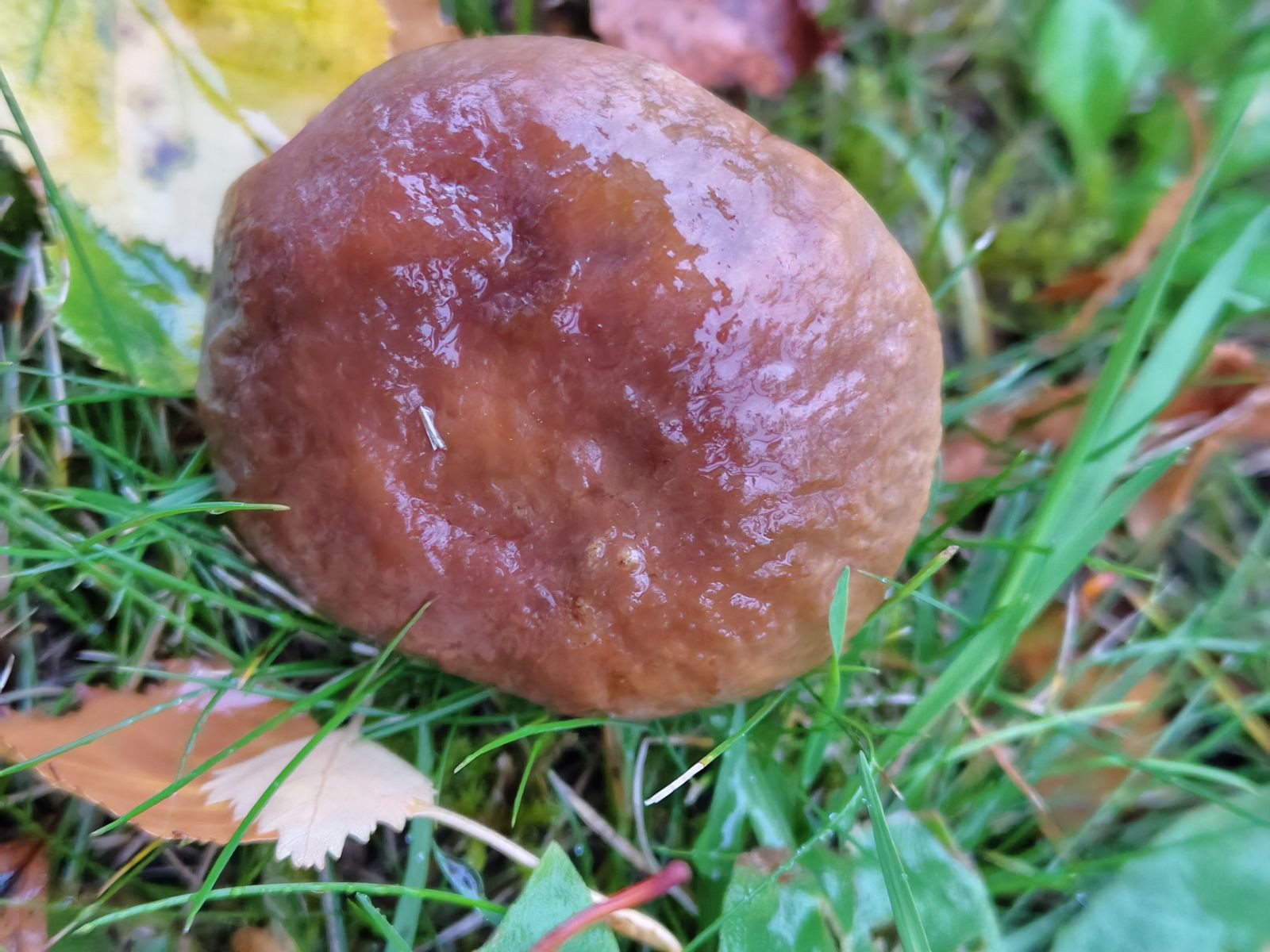 Hut: braun, roter Randsaum (!), leicht runzelig, bei Regen höchstens leicht schmierig