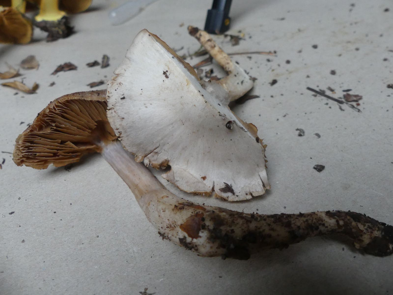 3.) Dieses Einzelexemplar bereitet mir das größte Kopfzerbrechen. Ich dachte erst an ein ausgeblasstes und etwas zu groß geratenes Exemplar von Cortinarius croceocoeruleus Safranblauer Schleimfuß, der mich schonmal mit stark ausgeblassten Hutfarben an der Nase herum geführt hat. Der kann es diesmal aber nicht sein, denn Huthaut und Fleisch schmecken völlig mild.