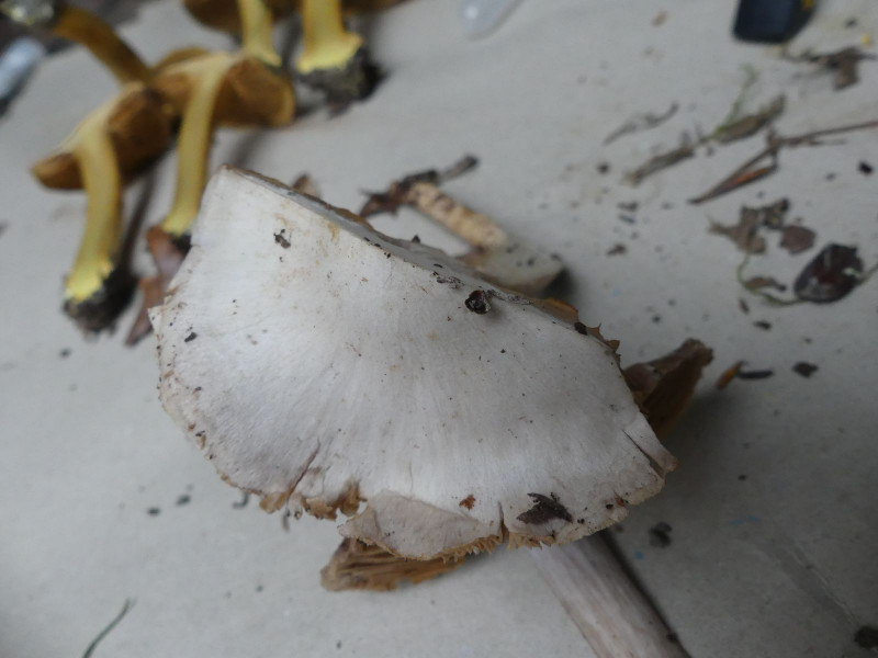• Mit Basalfilz meine ich den weißen Filz auf der Unterseite der Knolle. Vor der Testung muss man vielleicht noch vorsichtig die Erdreste entfernen. Bei Phlegmacien braucht man für die 3 Farbreaktionen (Hut, Fleisch und Basalfilz) nur KOH.