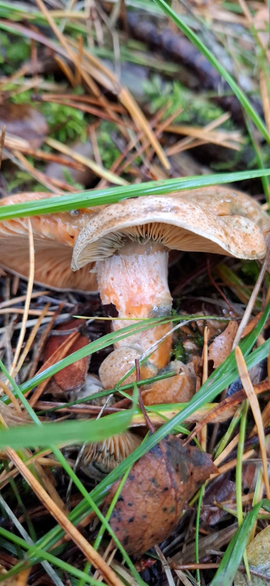 Seit etwa 10 Tagen wachsen an der selben Stelle immer wieder ordentlich viele Reizker. Obwohl grundsätzlich Mischwald, sind an dieser Stelle nur Kiefern. Meine Bücher haben 2 bis 3 Reizkerarten bei Kiefer, bei 123 Pilze finde ich 4.