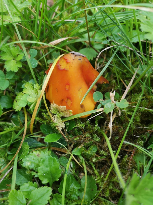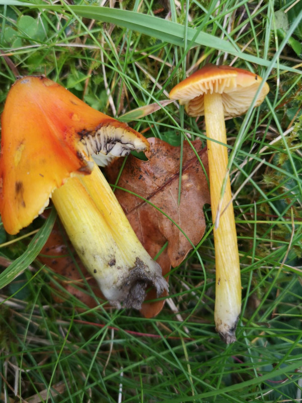 - Beschreibung Hut: breit- bis spitzkegelig, orange bis orangerot, im Alter am Rand schwärzend und ausblassend, schmierig (hat geregnet)