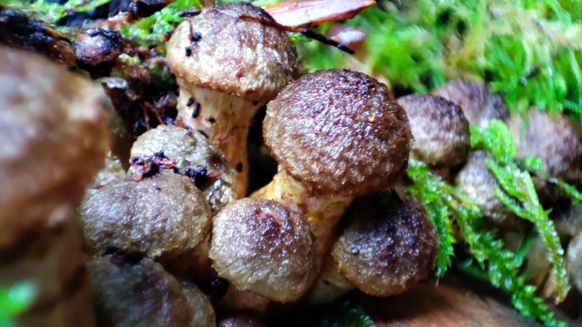 Evtl. ZwiebelfĂźĂiger Hallimasch? Jedenfalls auch noch Babies...mit struppigen KĂśpfchen.